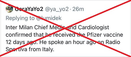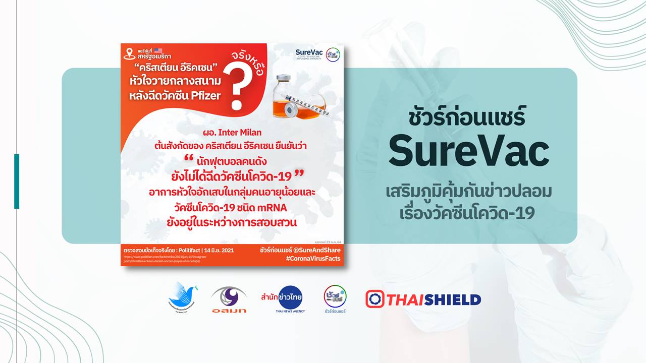 มีข้อมูลเท็จเผยแพร่ไปทั่วโลก เมื่อ ลูบอส โมเทิล แพทย์และบล็อกเกอร์ชาวเชค กล่าวอ้างผ่าน Twitter ส่วนตัวว่า สาเหตุที่ทำให้ คริสเตียน อีริคเซน นักฟุตบอลทีมชาติเดนมาร์กวัย 29 ปี มีอาการหัวใจวายและล้มหมดสติระหว่างการแข่งขันฟุตบอลชิงแชมป์แห่งชาติยุโรป 2020 เป็นเพราะอาการไม่พึงประสงค์จากวัคซีนโควิด 19 ของบริษัท Pfizer ที่ฉีดก่อนเดินทางมาร่วมการแข่งขันเมื่อวันที่ 31 พฤษภาคมที่ผ่านมา โดยอ้างว่าเป็นข้อมูลที่ยืนยันโดยหัวหน้าทีมแพทย์และแพทย์โรคหัวใจประจำทีม Inter Milan สโมสรต้นสังกัดของ คริสเตียน อีริคเซน ในประเทศอิตาลี