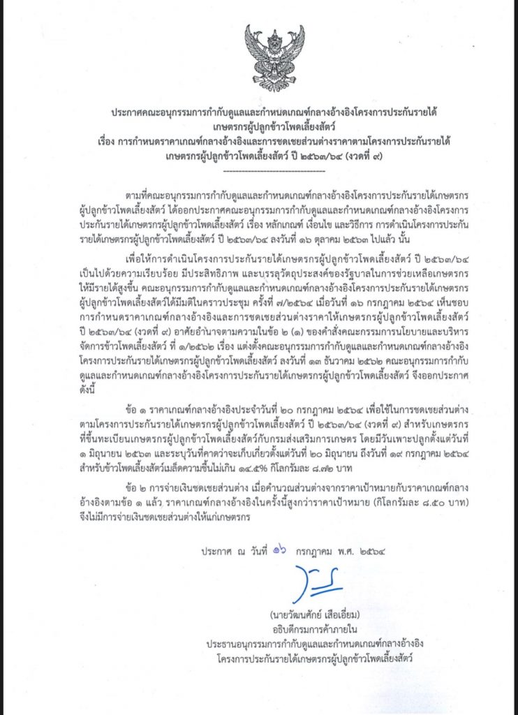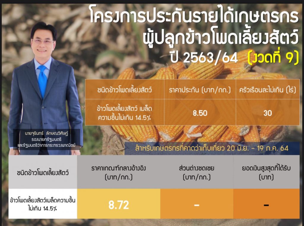 นางมัลลิกา บุญมีตระกูล มหาสุข ที่ปรึกษารัฐมนตรีว่าการกระทรวงพาณิชย กล่าวว่า จากมติที่ประชุมอนุกรรมการด้านราคาอ้างอิง ครั้งที่ 7/2564 เมื่อวันที่ 16 กรกฎาคม 2564 เห็นชอบกำหนดราคาเกณฑ์กลางอ้างอิงและการชดเชยส่วนต่างราคาให้เกษตรกรผู้ปลูกข้าวโพดเลี้ยงสัตว์ ปี 2563/64 งวดที่ 9 ที่ออกประกาศ ราคาเกณฑ์กลางอ้างอิงประจำวันที่ 20 กรกฎาคม 2564 สำหรับเกษตรกรที่ขึ้นทะเบียนเกษตรกรผู้ปลูกข้าวโพดเลี้ยงสัตว์กับกรมส่งเสริมการเกษตร โดยมีวันเพาะปลูกตั้งแต่วันที่ 1 มิถุนายน 2563 และระบุวันที่คาดว่าจะเก็บเกี่ยวตั้งแต่วันที่ 20 มิถุนายน ถึงวันที่ 19 กรกฎาคม 2564 ความชื้นไม่เกิน 14.5% กิโลกรัมละ 8.72 บาท