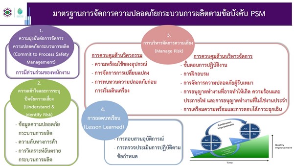 ทั้งนี้ การนิคมอุตสาหกรรมแห่งประเทศไทยได้วางมาตรการบริหารจัดการและส่งเสริมผู้ประกอบการในการลดความเสี่ยงการเกิดอุบัติเหตุ/อุบัติภัยภายในนิคมอุตสาหกรรม รวมทั้งออกข้อบังคับคณะกรรมการการนิคมอุตสาหกรรมแห่งประเทศไทย ว่าด้วยหลักเกณฑ์ วิธีการ และเงื่อนไขในการประกอบกิจการในนิคมอุตสาหกรรม (ฉบับที่ 4) พ.ศ. 2559 (ข้อบังคับฯ PSM)และที่แก้ไขเพิ่มเติมในส่วนที่เกี่ยวข้อง ซึ่งมีผลบังคับใช้กับโรงงานที่เข้าข่าย PSM ในนิคมอุตสาหกรรมทุกแห่งตั้งแต่วันที่ 13 พฤษภาคม 2564 เป็นต้นไป ทั้งนี้ ข้อบังคับฯ PSM ดังกล่าวเกี่ยวกับมาตรฐานการจัดการความปลอดภัยกระบวนการผลิต (Process Safety Management : PSM) และการตรวจประเมินความปลอดภัยกระบวนการผลิตในนิคมอุตสาหกรรม ซึ่งกำหนดให้โรงงานในนิคมอุตสาหกรรมที่มีกระบวนการผลิตที่เกี่ยวข้องกับสารเคมีอันตรายร้ายแรง (Highly Hazardous Chemicals) ในปริมาณครอบครองเท่ากับหรือมากกว่าปริมาณที่กำหนดในบัญชีท้ายข้อบังคับ หรือมีปริมาณครอบครองของเหลวไวไฟหรือก๊าซไวไฟตั้งแต่ 4,545 กิโลกรัม (10,000 ปอนด์) ขึ้นไป ต้องดำเนินการจัดการความปลอดภัยในกระบวนการผลิต และตรวจประเมินภายในทุก 1 ปีปฏิทิน โดยทีมผู้ตรวจประเมินภายในของสถานประกอบการ และรับการตรวจประเมินภายนอกทุก 3 ปีปฏิทิน โดยทีมผู้ตรวจประเมินภายนอกที่ได้ขึ้นทะเบียนกับ กนอ.
