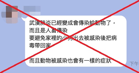 มีข้อมูลเท็จเผยแพร่ทางสื่อสังคมออนไลน์ในไต้หวัน โดยอ้างว่า โควิด 19 สามารถแพร่เชื้อจากคนสู่สัตว์และสัตว์สู่คน อย่าปล่อยให้สัตว์เลี้ยงนำเชื้อกลับมาบ้าน พร้อมชี้แจงว่าอาการของสัตว์เลี้ยงที่ติดเชื้อโควิด 19 ไม่แตกต่างจากที่เกิดกับมนุษย์