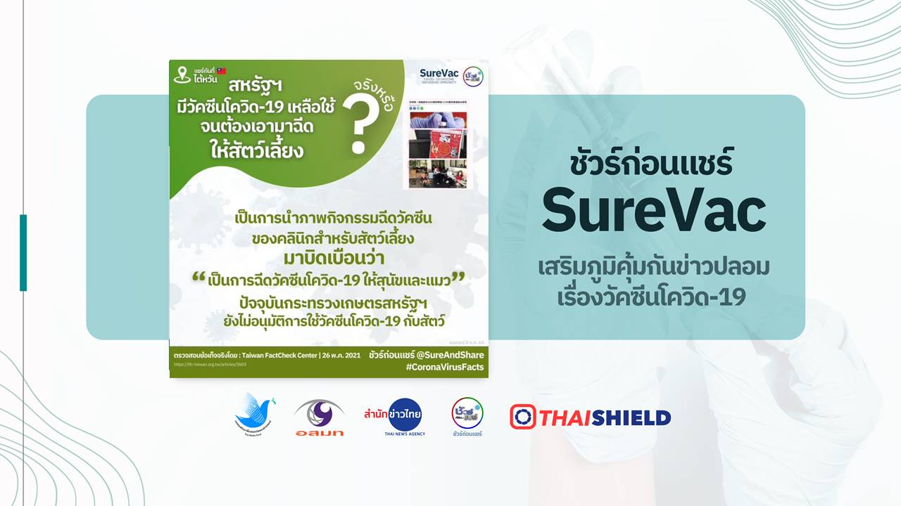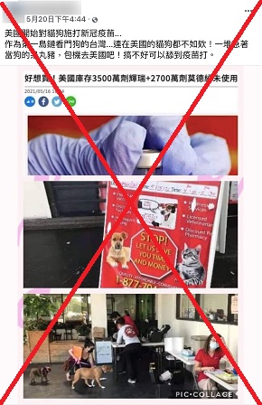 มีข้อมูลภาพและข้อความเท็จเผยแพร่ทางสื่อสังคมออนไลน์ในไต้หวัน โดยอ้างว่าสหรัฐอเมริกามีวัคซีนโควิด 19 เหลือใช้ จนต้องประกาศรับฉีดวัคซีนให้กับสุนัขและแมว ทั้งๆ ที่หลายประเทศทั่วโลกยังเผชิญการขาดแคลนวัคซีน