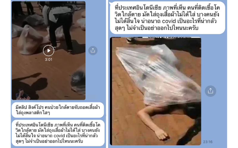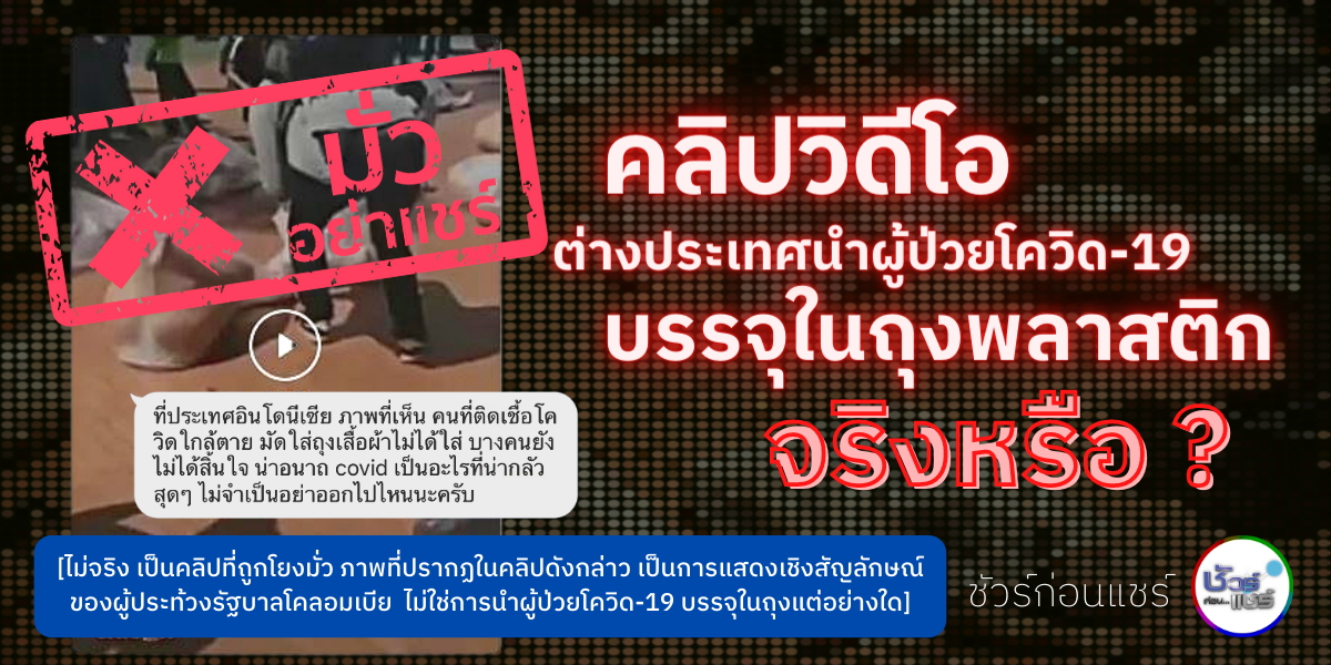 ตามที่มีการแชร์คลิปวิดีโอระบุว่า เป็นเหตุการณ์ที่ต่างประเทศ เช่น สิงคโปร์ หรือ อินโดนีเซีย ว่าเป็นการนำผู้ป่วยใกล้เสียชีวิตจากโควิด-19 บรรจุในถุงพลาสติกใส ๆ นั้น