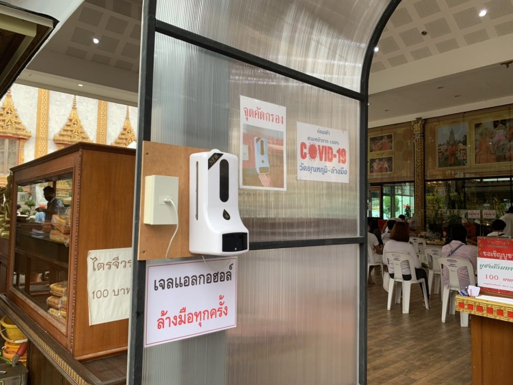 ขณะที่อาสน์สงฆ์มีการตั้งแท่นประเคนของพร้อมฉากกั้นให้ญาติโยมได้มาทำบุญถวายสังฆทาน สิ่งของ และดอกไม้ต่างๆ พร้อมจัดเก้าอี้แบบเว้นระยะห่างให้พุทธศาสนิกชนได้นั่งร่วมรับพรด้วย และหลังจากทำบุญต้องออกจากพื้นที่ทันที ไม่อนุญาตให้เดินรอบวัด หรืออยู่ในพื้นที่อื่นนอกเหนือจากลานบุญสังฆทานซึ่งทางวัดให้ข้อมูลว่า แม้จะเผชิญกับสถานการณ์โควิด -19 แต่ประชาชนยังทยอยเดินทางมาทำบุญ รับศีลรับพรต่อเนื่อง เพราะศาสนาพุทธและวัดยังเป็นที่พึ่งทางจิตใจให้กับพุทธศาสนิกชนได้เป็นอย่างดี