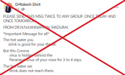 มีข้อมูลเท็จเผยแพร่ทาง Facebook และ WhatsApp ในประเทศอินเดีย โดยอ้างว่าไวรัสโควิด 19 จะแฝงอยู่ที่โพรงอากาศข้างจมูกหรือไซนัส ผ่านไป 4 ถึง 5 วันเชื้อจะลงปอด จึงจำเป็นต้องกำจัดเชื้อที่จมูกด้วยการสูดไอร้อน โดยอุณหภูมิ 50°C จะทำให้ไวรัสเป็นอัมพาต, 60°C ทำให้ไวรัสอ่อนแอจนถูกภูมิคุ้มกันกำจัดโดยง่าย, 70°C จะทำให้ไวรัสตายทั้งหมด คนที่อยู่บ้านควรสูดไอร้อนวันละครั้ง, คนที่ออกไปซื้อของที่ตลาดต้องสูดวันละ 2 ครั้ง, คนที่พบปะผู้คนหรือทำงานนอกบ้านต้องสูดวันละ 3 ครั้ง สูดครั้งละ 5 นาทีช่วงเช้าและเย็นเป็นเวลา 1 สัปดาห์ เชื้อก็จะหายไปเอง