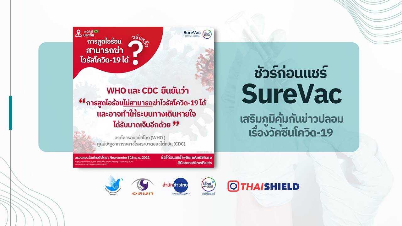 WHO และ CDC ยืนยันว่าการสูดไอร้อนไม่สามารถฆ่าไวรัสโควิด 19 ได้ และอาจทำให้ระบบทางเดินหายใจได้รับบาดเจ็บอีกด้วย
