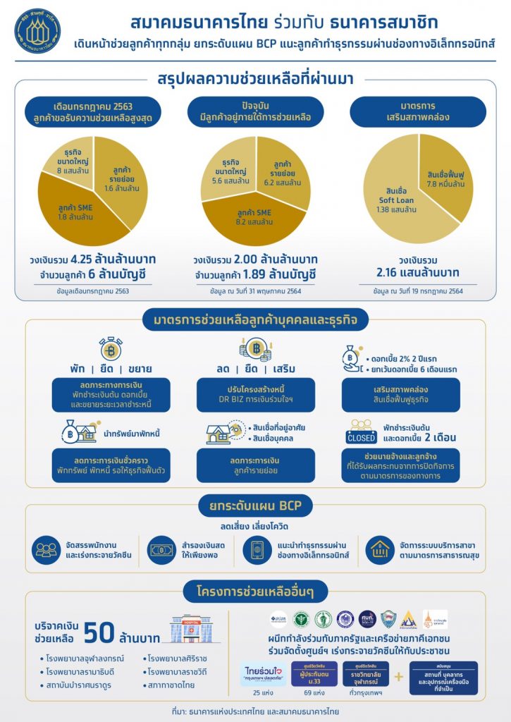 ธนาคารแห่งประเทศไทย (ธปท.) และสมาคมธนาคารไทย ได้หารือกันอย่างใกล้ชิด เพื่อประเมินผลกระทบต่อลูกค้าทุกกลุ่ม โดยพร้อมมีมาตรการช่วยเหลือลูกค้าเพิ่มเติม หากสถานการณ์ยืดเยื้อกว่าที่ประเมินไว้ อย่างไรก็ตาม ภาคธนาคารได้ออกมาตรการช่วยเหลือลูกค้าทุกกลุ่มอย่างต่อเนื่อง นับตั้งแต่เกิดการระบาดของโควิด-19 เมื่อต้นปี 2563 โดยในช่วงแรกออกมาตรการช่วยเหลือเป็นการทั่วไป เป็นมาตรการเร่งด่วน ทั้งการพักชำระเงินต้น ดอกเบี้ย และขยายระยะเวลาชำระหนี้ เพื่อลดภาระทางการเงินให้กับลูกค้า เสริมสภาพคล่องด้วยสินเชื่อดอกเบี้ยต่ำ (Soft Loan) หลังจากนั้นได้ออกมาตรการช่วยเหลือเฉพาะกลุ่ม เพื่อช่วยเหลือลูกค้าให้ตรงจุด เช่น มาตรการปรับโครงสร้างหนี้ และเมื่อมีการระบาดระลอกใหม่ทำให้เศรษฐกิจต้องใช้เวลานานขึ้นในการฟื้นตัว จึงมีมาตรการฟื้นฟูธุรกิจเพิ่มเติม ประกอบด้วย สินเชื่อฟื้นฟูธุรกิจ วงเงิน 250,000 ล้านบาท และมาตรการพักทรัพย์พักหนี้ วงเงิน 100,000 ล้านบาท พร้อมออกมาตรการช่วยเหลือลูกค้ารายย่อย ระยะที่ 3 และล่าสุดได้ออกมาตรการเร่งด่วนด้วยการพักชำระเงินต้นและดอกเบี้ยให้แก่ลูกค้า SMEs และลูกค้ารายย่อยที่ได้รับผลกระทบโดยตรง เป็นระยะเวลา 2 เดือน ทั้งที่เป็นนายจ้างและลูกจ้างในสถานประกอบการ ในพื้นที่ควบคุมฯ และนอกพื้นที่ควบคุมฯ ที่ต้องปิดกิจการจากมาตรการของทางการ