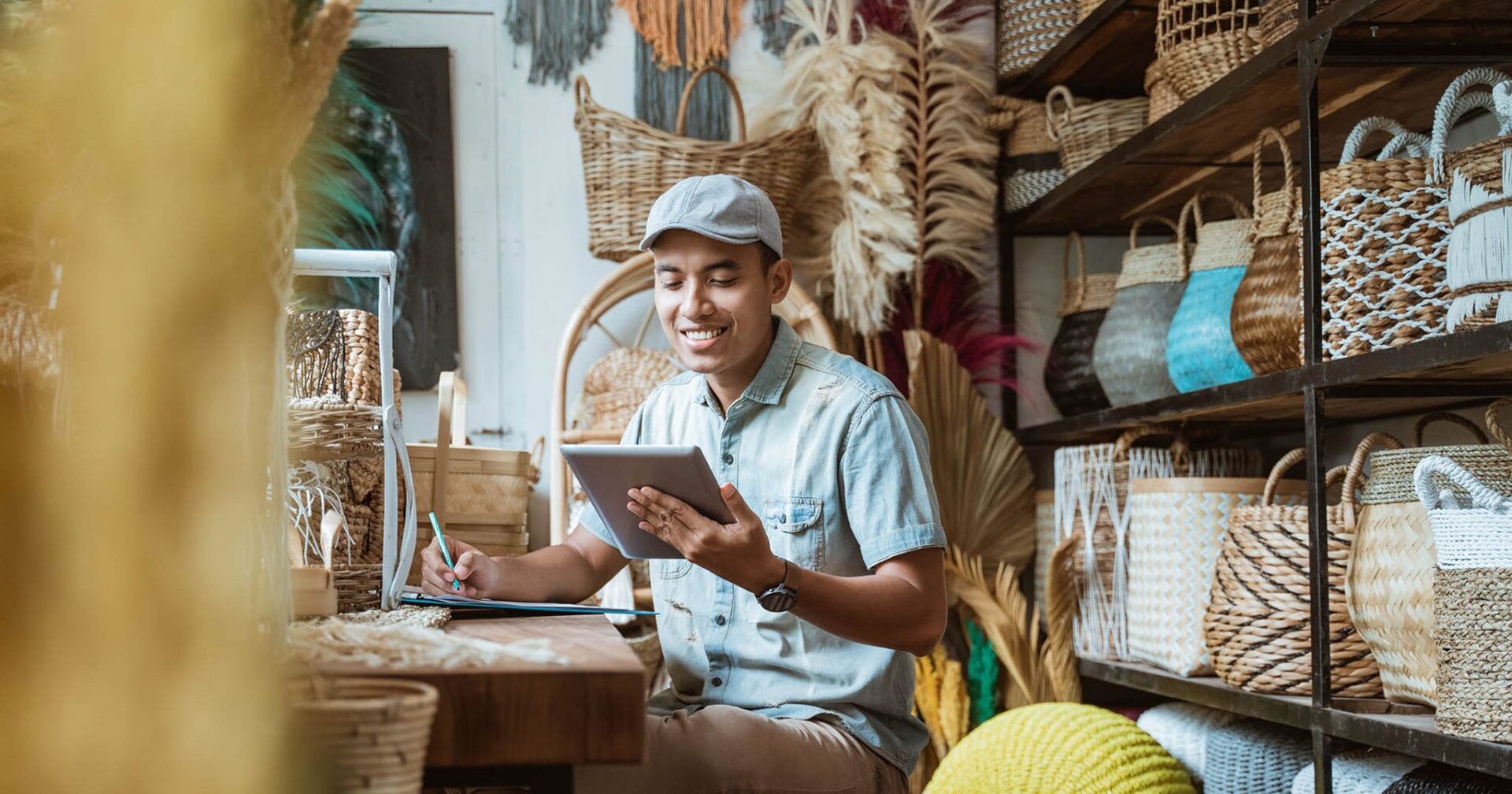 The shop owner notes with a pen while using a digital tablet while sitting in a craft store
