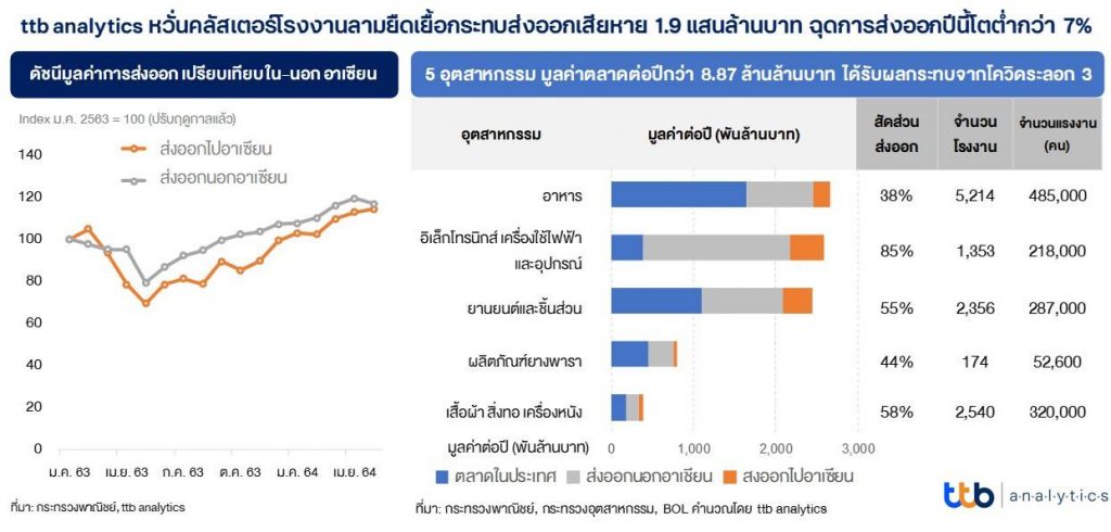 ศูนย์วิเคราะห์เศรษฐกิจ ธนาคารทหารไทยธนชาต (ttb analytics) วิเคราะห์การติดเชื้อโควิด-19ในโรงงานหรือคลัสเตอร์โรงงาน และการชะลอของความต้องการซื้อตลาดอาเซียน เป็นปัจจัยท้าทายการส่งออก จากข้อมูลล่าสุด Thai Stop Covid โดยกรมอนามัย ตั้งแต่เดือนเมษายน-กรกฎาคม 2564 มีโรงงานติดเชื้อสะสมมากถึง 1,607 โรงงาน เป็นโรงงานขนาดใหญ่ร้อยละ 67 ซึ่งมีแรงงานจำนวนมาก โดยเป็นทั้งโรงงานผลิตเพื่อใช้ภายในประเทศและป้อนตลาดต่างประเทศ คลัสเตอร์โรงงานจึงเป็นคลัสเตอร์ใหญ่นอกเหนือไปจากแคมป์ก่อสร้าง