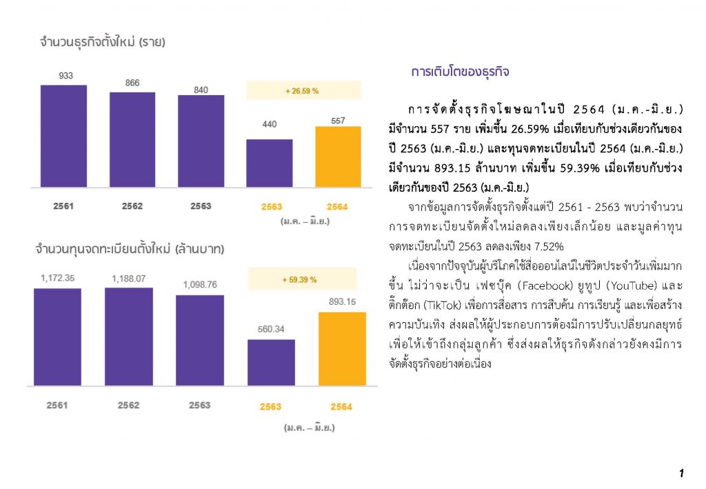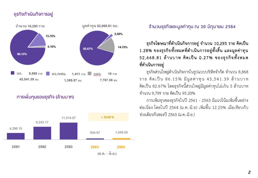 ทั้งนี้ จากข้อมูลการจดทะเบียนจัดตั้งธุรกิจของกรมพัฒนาธุรกิจการค้า พบว่าในปี 2564 (มกราคม – มิถุนายน) ธุรกิจโฆษณา มีจำนวนการจดทะเบียนฯ ใหม่ ทั้งสิ้น 557 ราย เพิ่มขึ้นร้อยละ 26.59 เมื่อเทียบกับช่วงเวลาเดียวกันของปี 2563 (440 ราย) และทุนจดทะเบียนของธุรกิจโฆษณาในช่วงครึ่งปีแรก ปี 2564 มีจำนวน 893.15 ล้านบาท เพิ่มขึ้นร้อยละ 59.39 เมื่อเทียบกับช่วงเวลาเดียวกันของปี 2563 (560.34 ล้านบาท) เป็นการส่งสัญญาณแนวโน้มการฟื้นตัวที่ดีของธุรกิจโฆษณาในประเทศไทย”