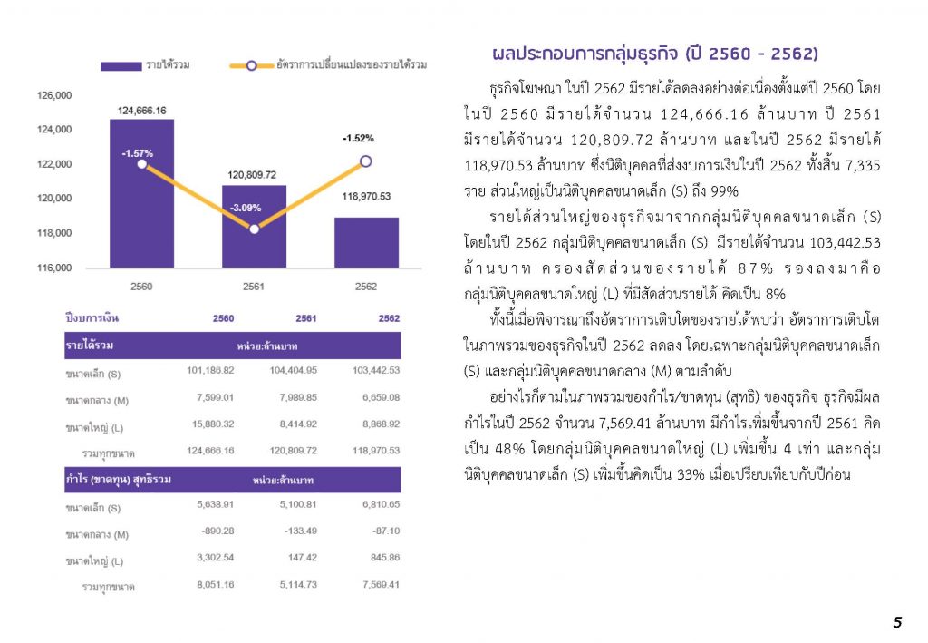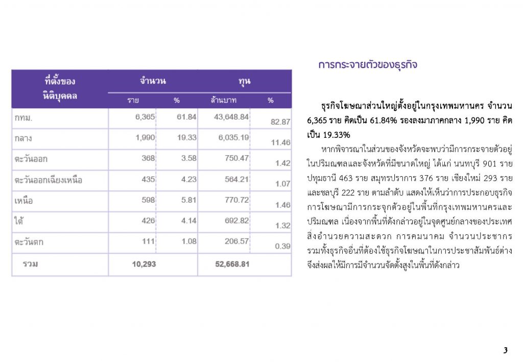 อย่างไรก็ตาม ปัจจุบันมีธุรกิจโฆษณาที่ดำเนินกิจการอยู่จำนวนทั้งสิ้น 10,293 ราย คิดเป็นร้อยละ 1.28 ของธุรกิจทั้งหมดที่ดำเนินกิจการอยู่ และมูลค่าทุนรวม 52,668.81 ล้านบาท คิดเป็นร้อยละ 0.27 ของมูลค่าทุนธุรกิจที่ดำเนินกิจการอยู่ ส่วนใหญ่ดำเนินกิจการในรูปแบบบริษัทจำกัด จำนวน 8,868 ราย คิดเป็นร้อยละ 86.15 มูลค่าทุนรวม 43,541.39 ล้านบาท คิดเป็นร้อยละ 82.67 ธุรกิจโฆษณาส่วนใหญ่ตั้งอยู่ในกรุงเทพมหานคร จำนวน 6,365 ราย คิดเป็นร้อยละ 61.84 รองลงมาคือ ภาคกลาง 1,990 ราย คิดเป็นร้อยละ 19.33 ภาคเหนือ 598 ราย คิดเป็นร้อยละ 5.81 ภาคตะวันออกเฉียงเหนือ 435 ราย คิดเป็นร้อยละ 4.23 ภาคใต้ 426 ราย คิดเป็นร้อยละ 4.14 ภาคตะวันออก 368 ราย คิดเป็นร้อยละ 3.58 และภาคตะวันตก 111 ราย คิดเป็นร้อยละ 1.08