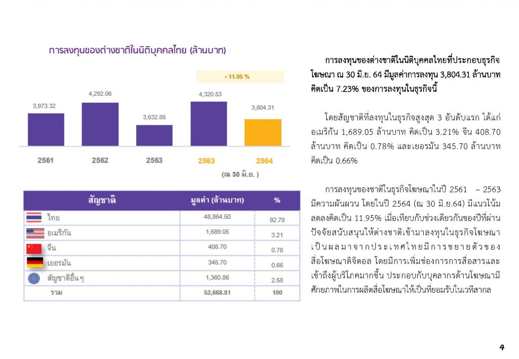 นอกจากนี้ ในส่วนของนักลงทุนชาวต่างชาติที่เข้ามาประกอบธุรกิจโฆษณาในประเทศไทย ณ วันที่ 30 มิถุนายน 2564 มีมูลค่าการลงทุนจำนวน 3,804.31 ล้านบาท คิดเป็นร้อยละ 7.23 ของการลงทุนในธุรกิจโฆษณา โดยสัญชาติที่เข้ามาลงทุนสูงสุด 3 อันดับแรก ได้แก่ อเมริกัน 1,689.05 ล้านบาท คิดเป็นร้อยละ 3.21 จีน 408.70 ล้านบาท คิดเป็นร้อยละ 0.78 และ เยอรมัน 345.70 ล้านบาท คิดเป็นร้อยละ 0.66 ปัจจัยสนับสนุนให้ธุรกิจโฆษณาดิจิทัลมีอัตราการเติบโตที่ดี คือ ภาคธุรกิจสามารถเลือกช่องทางการตลาดให้เข้าถึงกลุ่มเป้าหมายได้ตรงจุดมากขึ้น มีแพลตฟอร์มที่เข้าถึงได้ง่ายและรวดเร็ว และการมีเทคโนโลยีที่สามารถรองรับให้ผู้บริโภคเปิดรับสื่อได้ตลอดเวลา โดยเฉพาะช่องทางโซเชียลมีเดียที่มีการเติบโตของการลงเงินโฆษณาถึงร้อยละ 20 โดยสื่อดิจิทัลที่มีเม็ดเงินการลงทุนในปี 2564 ได้แก่ Facebook ร้อยละ 32, YouTube ร้อยละ 23 และ TikTok มีแนวโน้มการเติบโตสูงอยู่ที่ร้อยละ 21 การลงทุนในแต่ละสื่อมีมูลค่าเม็ดเงินสูงถึงพันล้านบาท โดยการโฆษณาทางโซเชียลมีเดียในปัจจุบันมีความเหมาะสมกับกลุ่มธุรกิจเอสเอ็มอีหรือผู้ที่เพิ่งเริ่มต้นดำเนินธุรกิจ เนื่องจากเป็นช่องทางการสื่อสารกับผู้บริโภคได้อย่างสะดวกรวดเร็วและใช้เงินลงทุนที่ไม่สูงมากนัก โดยการดำเนินธุรกิจโฆษณาต้องคำนึงถึงกลุ่มเป้าหมายเป็นลำดับแรก การเลือกช่องทางการสื่อสาร การเลือกช่วงเวลา และความถี่ที่เหมาะสม รวมทั้งการคิดนอกกรอบในการสร้างสรรค์สื่อโฆษณา เพื่อให้กลุ่มเป้าหมายที่มีความหลากหลายเข้าใจในคุณค่าของผลิตภัณฑ์หรือสินค้าของลูกค้าได้อย่างแท้จริง จะทำให้ธุรกิจโฆษณาสามารถอยู่รอดในตลาดและสามารถแข่งขันได้อย่างสมบูรณ์และยั่งยืน.-สำนักข่าวไทย