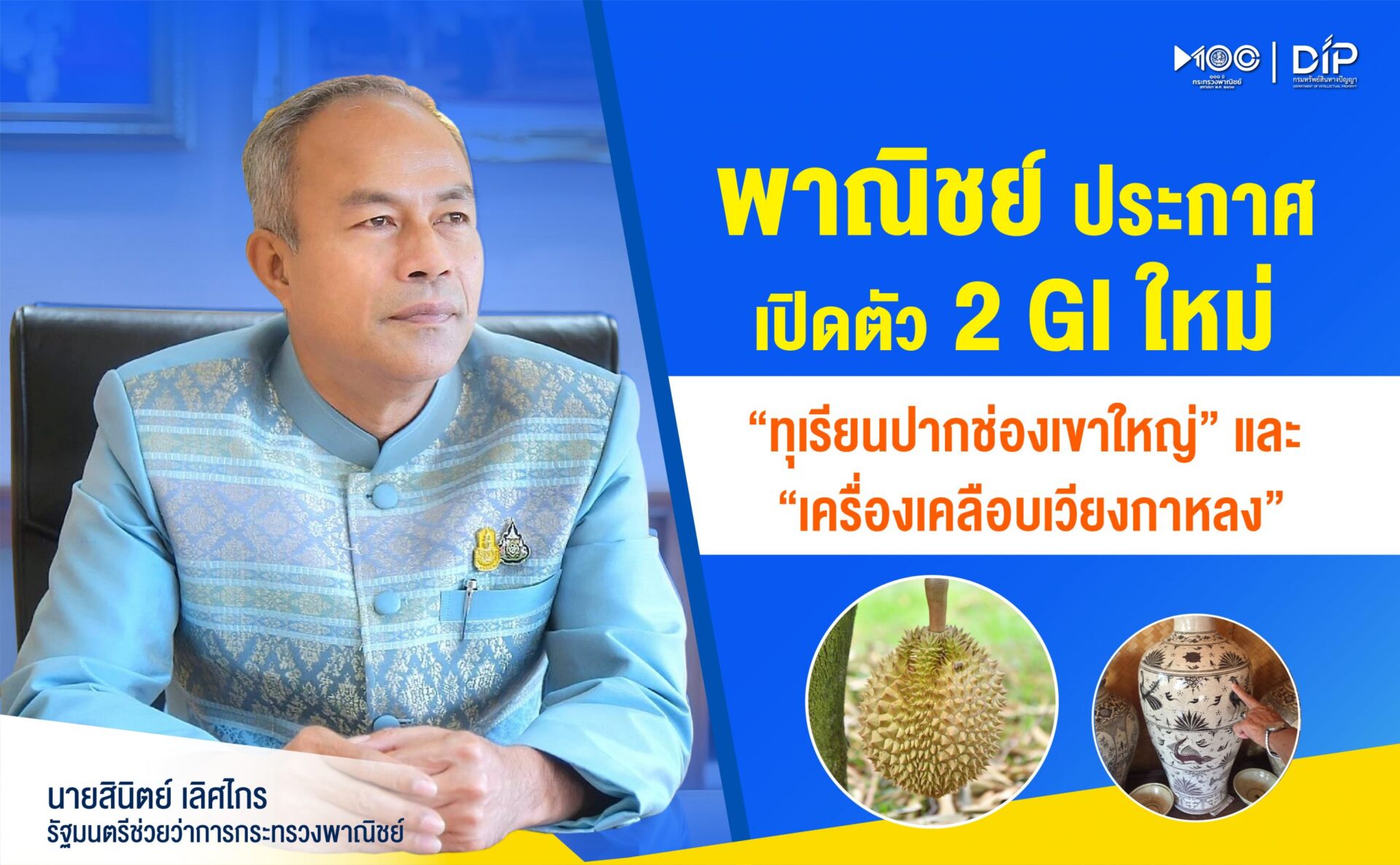 นายสินิตย์ เลิศไกร รัฐมนตรีช่วยว่าการกระทรวงพาณิชย์ เปิดเผยว่า กระทรวงพาณิชย์ โดยกรมทรัพย์สินทางปัญญา ได้ประกาศขึ้นทะเบียนสิ่งบ่งชี้ทางภูมิศาสตร์ (GI) อีก 2 รายการ ได้แก่ ทุเรียนปากช่องเขาใหญ่ และเครื่องเคลือบเวียงกาหลง ทำให้ปัจจุบันประเทศไทยมีสินค้าที่ได้รับการขึ้นทะเบียนเป็นสินค้า GI แล้ว 141 รายการ จาก 77 จังหวัด ซึ่งการขึ้นทะเบียน GI จะช่วยคุ้มครองชื่อสินค้าให้เป็นสิทธิเฉพาะของชุมชน มีการรักษามาตรฐานของสินค้าและภูมิปัญญาท้องถิ่น สร้างความเชื่อมั่นในแหล่งต้นกำเนิดคุณภาพของสินค้า และจะช่วยเพิ่มมูลค่าให้สินค้าและสร้างรายได้ให้กับชุมชนด้วยความเป็นเอกลักษณ์เฉพาะตัวที่สามารถผลิตได้เฉพาะท้องถิ่น