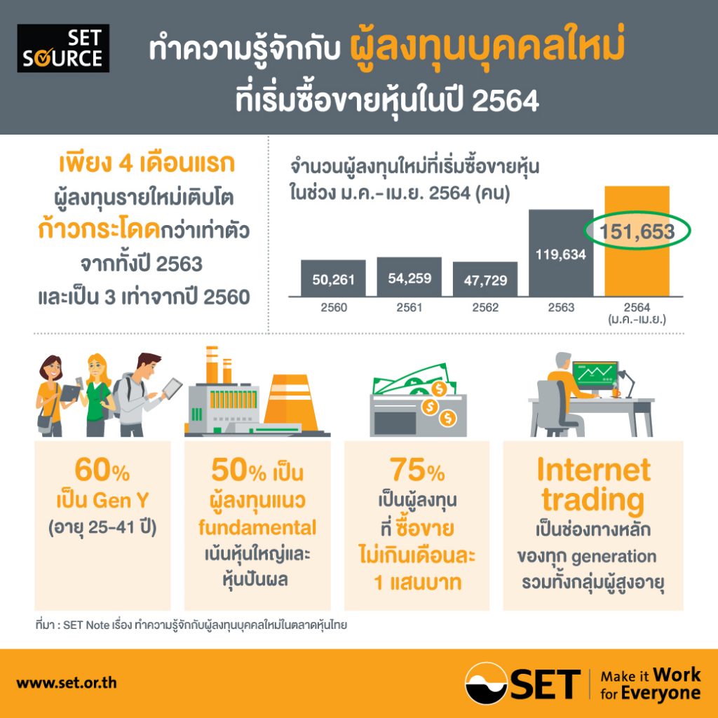 ตลาดหลักทรัพย์แห่งประเทศไทย เปิดเผยข้อมูลนักลงทุนในตลาดหุ้นไทย ณ สิ้นเดือน เม.ย. 64 พบว่าตลาดหุ้นไทยมีผู้ลงทุนที่มีบัญชีซื้อขายหุ้นรวม 4.38 ล้านบัญชี หรือ 1.84 ล้านคน โดยมีธุรกรรมซื้อขายหุ้นใน ช่วง 4 เดือนแรกของปีนี้ 0.82 ล้านคน ด้วยมูลค่าซื้อขายเฉลี่ยวันละ 46,394 ล้านบาท หรือคิดเป็นเกือบครึ่งหนึ่งของมูลค่าซื้อขายหุ้นทั้งตลาด เพียงช่วง 4 เดือนแรกของปี 64 มีผู้ลงทุนบุคคลใหม่ที่เริ่มเข้าซื้อขายหุ้นเป็นครั้งแรกสูงถึง 151,653 คน คิดเป็นมากกว่า 1 เท่าตัวจากยอดรวมทั้งปีก่อนหน้า และเป็นเกือบ 20% ของผู้ลงทุนบุคคลทั้งหมดที่ซื้อขายหุ้นในปีนี้