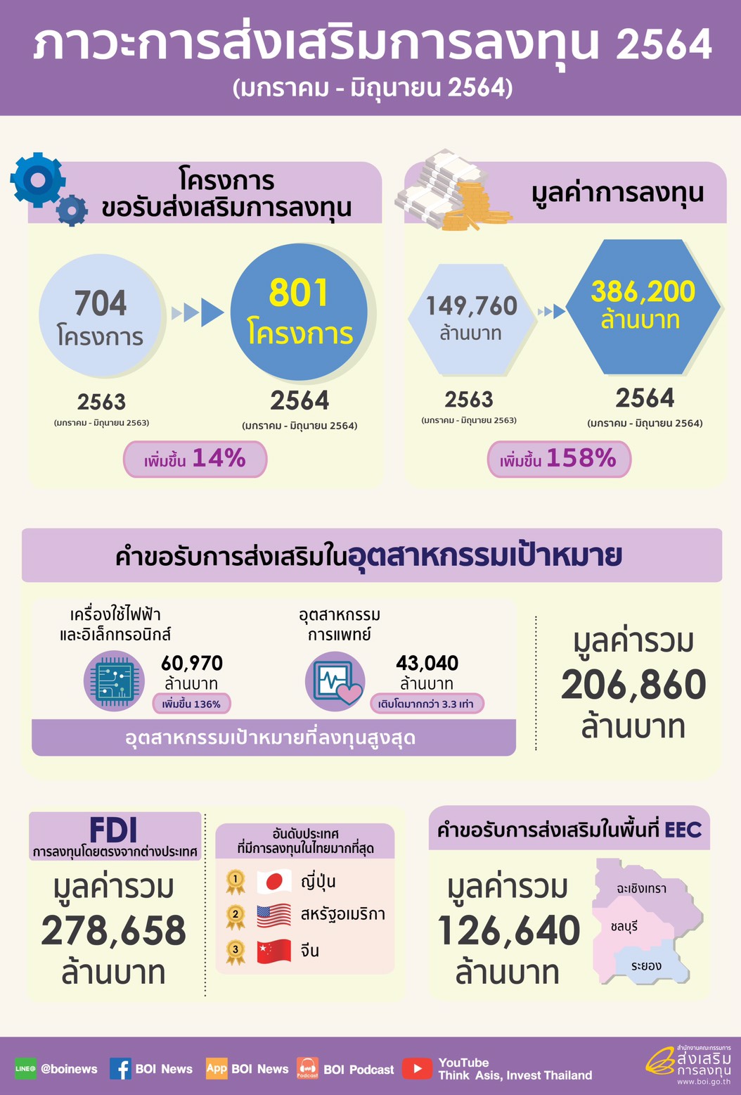 ทั้งนี้ การลงทุนโดยตรงจากต่างประเทศ (FDI) มีโครงการยื่นขอรับการส่งเสริมจำนวน 403 โครงการ มูลค่าเงินลงทุนรวม 278,658 ล้านบาท เพิ่มขึ้นถึง 3.8 เท่าจากช่วงเดียวกันของปีก่อน และสูงกว่าปี 2563 ทั้งปี (171,160 ล้านบาท) ร้อยละ 62 โดยประเทศที่ยื่นขอรับการส่งเสริมที่มีมูลค่าเงินลงทุนมากที่สุด 3 อันดับแรก ได้แก่ ญี่ปุ่นมีมูลค่าเงินลงทุน 42,773 ล้านบาท รองลงมาคือ สหรัฐฯ มีมูลค่าเงินลงทุน 24,131 ล้านบาท และจีนมีมูลค่าเงินลงทุน 18,615 ล้านบาท ตามลำดับ