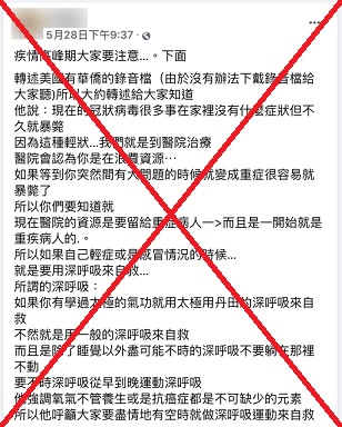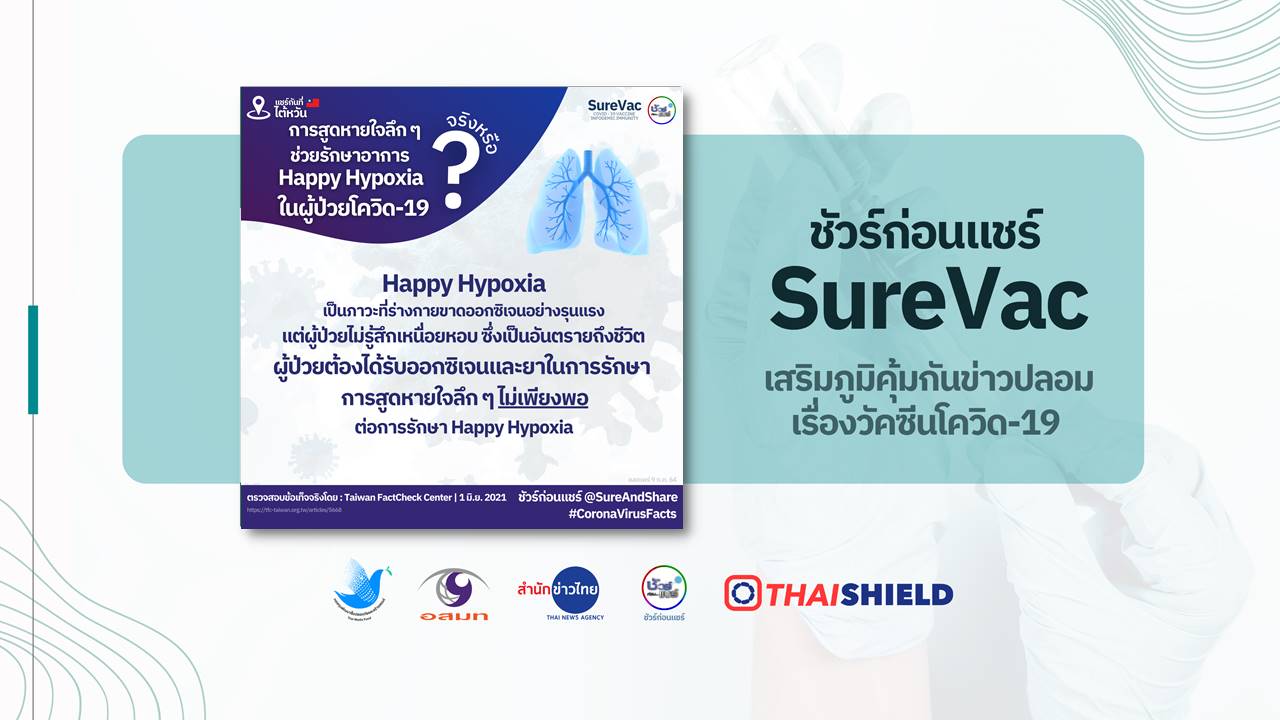 มีข้อมูลเท็จเผยแพร่ทางสื่อสังคมออนไลน์ในไต้หวัน โดยอ้างว่าการสูดหายใจลึกๆ จะช่วยป้องกันการเกิด Happy Hypoxia หรือภาวะที่ร่างกายขาดออกซิเจน โดยไม่มีอาการขาดอากาศหายใจ ซึ่งพบได้ในกลุ่มผู้ป่วยโควิด 19 การฝึกสูดหายใจลึกๆ ตลอดเวลา จะช่วยให้ร่างกายไม่ขาดออกซิเจนจากภาวะ Happy Hypoxia