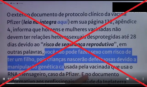 คู่มือการทดลองวัคซีนโควิด 19 ของบริษัท Pfizer ในหน้า 132 มีคำแนะนำให้อาสาสมัครชายหญิงงดเว้นจากการมีเพศสัมพันธ์เป็นเวลา 28 วันหลังจากรับวัคซีนจริง แต่ไม่มีข้อความไหนที่ระบุว่าทารกที่เกิดจากผู้รับวัคซีนจะมีความผิดปกติอย่างที่กล่าวอ้าง