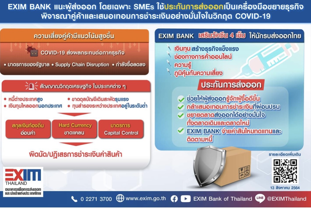 ทั้งนี้ EXIM BANK เป็นองค์กรรับประกันแห่งเดียวของไทยที่มีบริการประกันการส่งออกคุ้มครองความเสี่ยงให้แก่ผู้ส่งออกไทยจากการไม่ได้รับชำระเงินค่าสินค้าจากผู้ซื้อในต่างประเทศในหลากหลายรูปแบบ อาทิ การปรับปรุงเงื่อนไขให้ยืดหยุ่นและสะดวก อนุมัติเร็ว เพื่อตอบสนองความต้องการของผู้ส่งออก โดยเฉพาะ SMEs นอกจากนี้ ประกันการส่งออกยังช่วยให้ผู้ส่งออกรู้จักผู้ซื้อดีขึ้น กล้าเสนอเทอมการชำระเงินที่ผ่อนปรน และขยายตลาดส่งออกได้อย่างมั่นใจ ทั้งในตลาดเดิมและตลาดใหม่ โดย EXIM BANK จะจ่ายค่าสินไหมทดแทนและติดตามหนี้ เมื่อเกิดความเสียหายจากการไม่ได้รับชำระเงินค่าสินค้า นับตั้งแต่เปิดดำเนินการในปี 2537 บริการประกันการส่งออกของ EXIM BANK ก่อให้เกิดปริมาณธุรกิจส่งออกของไทยเป็นมูลค่ากว่า 1.55 ล้านล้านบาท ในช่วง 7 เดือนแรกของปี 2564 มีลูกค้าประกันการส่งออกของ EXIM BANK ยื่นขอรับค่าสินไหมทดแทนจำนวนทั้งสิ้น 12 ราย เป็นมูลค่ากว่า 22.6 ล้านบาท โดยประมาณ 66% มีสาเหตุจากผู้ซื้อในต่างประเทศปฏิเสธการชำระเงินค่าสินค้า รองลงมาอีก 26% ผู้ซื้อล้มละลาย และ 8% ผู้ซื้อปฏิเสธการรับมอบสินค้า