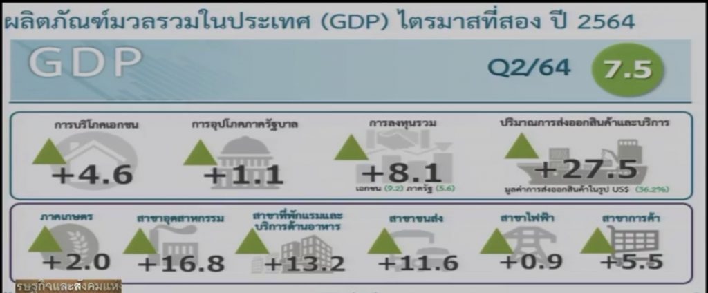 นายอนุชา พิชยนันท์ เลขาธิการสภาพัฒนาเศรษฐกิจและสังคมแห่งชาติ (สภาพัฒน์) แถลงการขยายตัวเศรษฐกิจไทย GDP ในไตรมาส 2/64 ขยายตัว 7.5% เมื่อเทียบกับไตรมาส 2/63 และขยายตัว 0.4% เมื่อเทียบกับไตรมาส 1/64 ปัจจัยสำคัญที่สนับสนุนการขยายตัวของเศรษฐกิจในไตรมาส 2/64 เมื่อเทียบกับช่วงเดียวกับของปีก่อน มาจากการบริโภคภาคเอกชน ที่ขยายตัว 4.6% และการลงทุนรวมขยายตัว 8.1% โดยการลงทุนจากภาคเอกชนขยายตัว 9.2% และการลงทุนภาครัฐขยายตัว 5.6% ส่วนมูลค่าการส่งออกสินค้าขยายตัว 36.2% ทำให้ภาพรวมเศรษฐกิจครึ่งปีแรกขยายตัวราว 2% จากฐานปีก่อนที่ต่ำผิดปกติ และมีการขยายตัวในบางสาขาสำคัญ ได้แก่ ภาคอุตสาหกรรม ภาคการเกษตร และภาคส่งออกเป็นหลัก ส่วนภาคการท่องเที่ยวยังไม่ฟื้นตัว