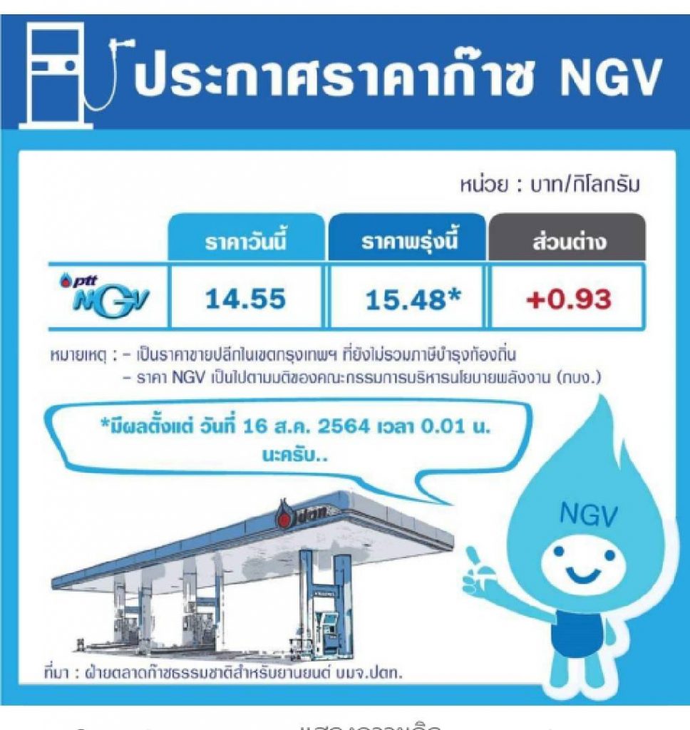 ส่วนราคาก๊าซNGVที่วันนีั(16ส.ค.)ทาง.บมจ.ปตท.ประกาศขยับราคาขึ้น0.93บาท/กก.ราคาขายปลีกเขตกทม.อยู่ที่15.48บาท/กก.นั้น.ยอมรับว่าเป็นราคาผันแปรตามราคาต้นทุนก๊าซที่ขยับขึ้นตามราคาน้ำมันตลาดโลกที่ขยับขึ้น.อย่างไรก็ตามยอมรับว่ากระทบต่อผู้ใช้เอ็นจีวีซึ่งทางกระทรวงพลังงานได้หารือกับปตท.ถึงความเดือดร้อนว่าจะช่วยเหลือผู้ใช้ได้หรือไม่โดยได้แจ้งว่าทางสมาคมแท็กซี่ได้ขอลดราคาเหลือ10บาท/กก.นอกจากนี้จากการสำรวจคนขับแท็กซี่พบว่าต้นทุนหลักที่กระทบไม่ใช่ราคาเชื้อเพลิงแต่เป็นค่าเช่าแท็กซี่ซึ่งทาง.สนพ.ก็ได้ส่งความคิดเห็นเหล่านี้ไปให้กรมการขนส่งทางบกว่าจะเข้ามาช่วยเหลือได้อย่างไร