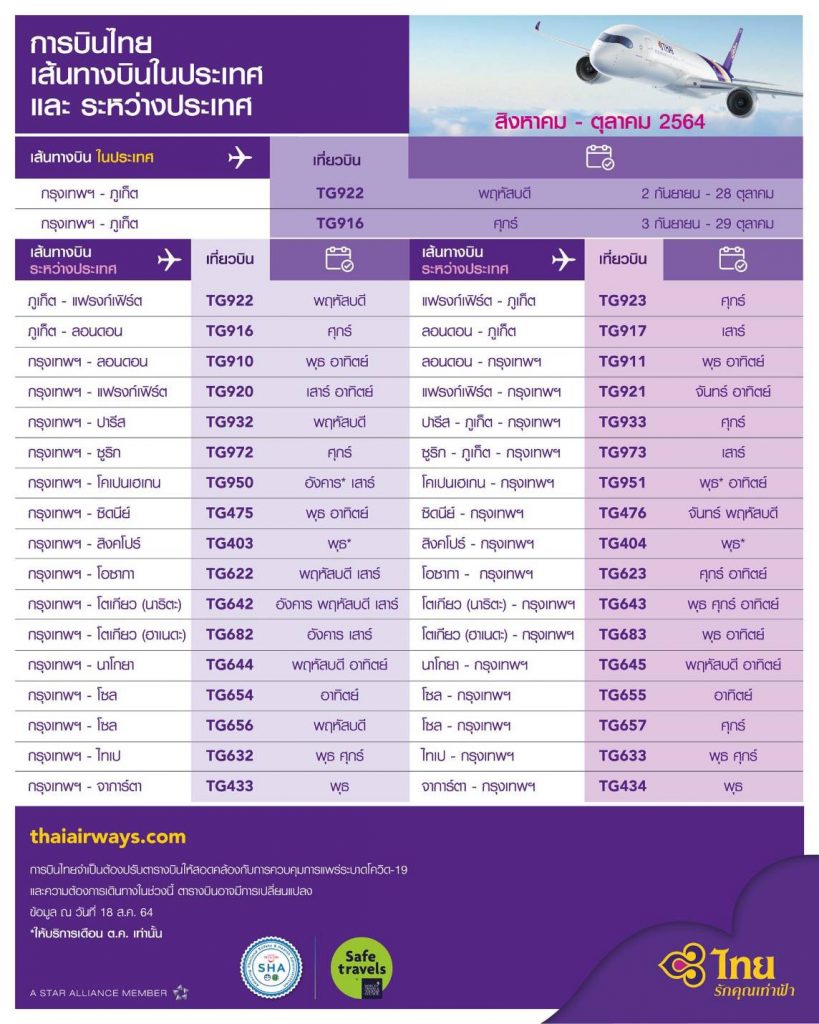 นายนนท์ กลินทะ ประธานเจ้าหน้าที่สายการพาณิชย์ บริษัท การบินไทย จำกัด (มหาชน) เปิดเผยว่า เพื่อให้สอดคล้องกับปริมาณความต้องการการเดินทาง รวมทั้งปรับตารางบินให้เป็นไปตามมาตรการควบคุมการแพร่ระบาดของโรคโควิด-19 บริษัทฯ ให้บริการเที่ยวบินขนส่งผู้โดยสารในประเทศ และระหว่างประเทศ ระหว่างเดือนสิงหาคมถึงตุลาคม 2564 โดยมีรายละเอียดดังนี้