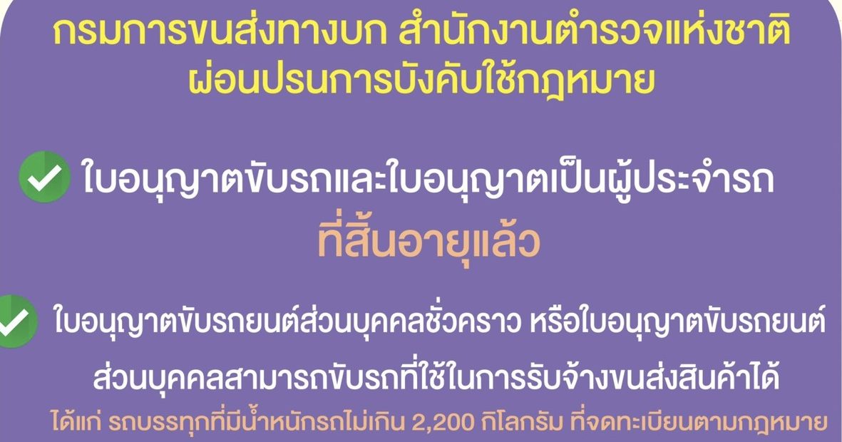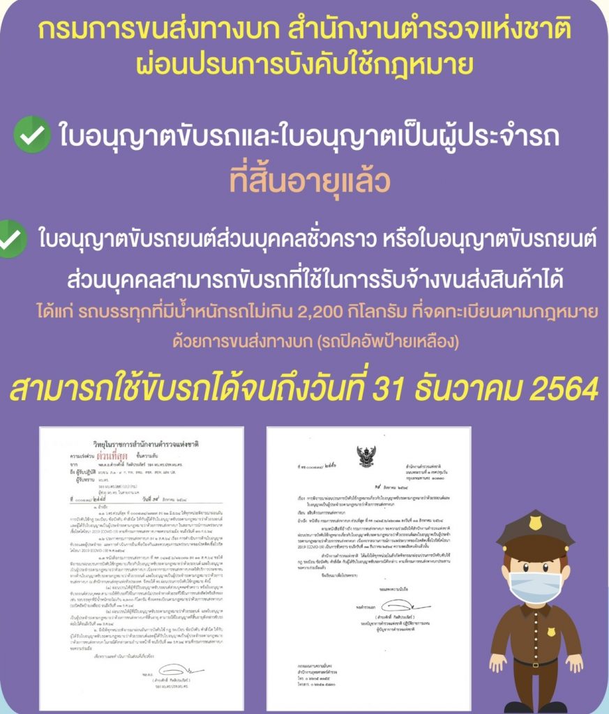 กรมการขนส่งทางบกจึงได้ประสานสำนักงานตำรวจแห่งชาติ ขอให้พิจารณาผ่อนปรนการบังคับใช้กฎหมายต่อเนื่อง ซึ่งสำนักงานตำรวจแห่งชาติได้พิจารณาขยายระยะเวลาผ่อนปรนการบังคับใช้กฎ ระเบียบ ข้อบังคับ คำสั่งใด กับผู้ได้รับใบอนุญาตขับรถตามกฎหมายว่าด้วยรถยนต์ และผู้ได้รับใบอนุญาตเป็นผู้ประจำรถตามกฎหมายว่าด้วยการขนส่งทางบกที่สิ้นอายุแล้ว ยังสามารถใช้ขับรถต่อไปได้จนถึงวันที่ 31 ธันวาคม 2564