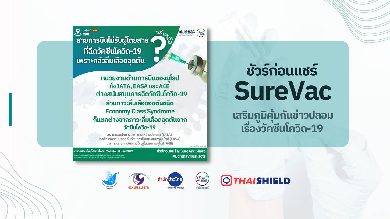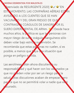ผู้ตรวจสอบข้อเท็จจริงของ Maldita ได้สอบถามไปยังหน่วยงานด้านการบินของยุโรป ทั้งสมาคมขนส่งทางอากาศระหว่างประเทศ (IATA), องค์การความปลอดภัยด้านการบินแห่งสหภาพยุโรป (EASA) และ Airlines for Europe สมาคมสายการบินรายใหญ่ในสหภาพยุโรป (A4E) ซึ่งต่างยืนยันว่า ไม่มีสายการบินรายใดห้ามผู้โดยสารที่ฉีดวัคซีนโควิด 19 ขึ้นเครื่อง จากความกังวลเรื่องการเกิดลิ่มเลือดอุดตันระหว่างการเดินทาง พร้อมแนะนำให้พนักงานของสายการบินเข้ารับการฉีดวัคซีนโควิด 19 และต่างให้ความเห็นว่าการฉีดวัคซีนเป็นหนทางเดียวที่จะทำให้เสรีภาพในการเดินทางกลับคืนมาอีกครั้ง