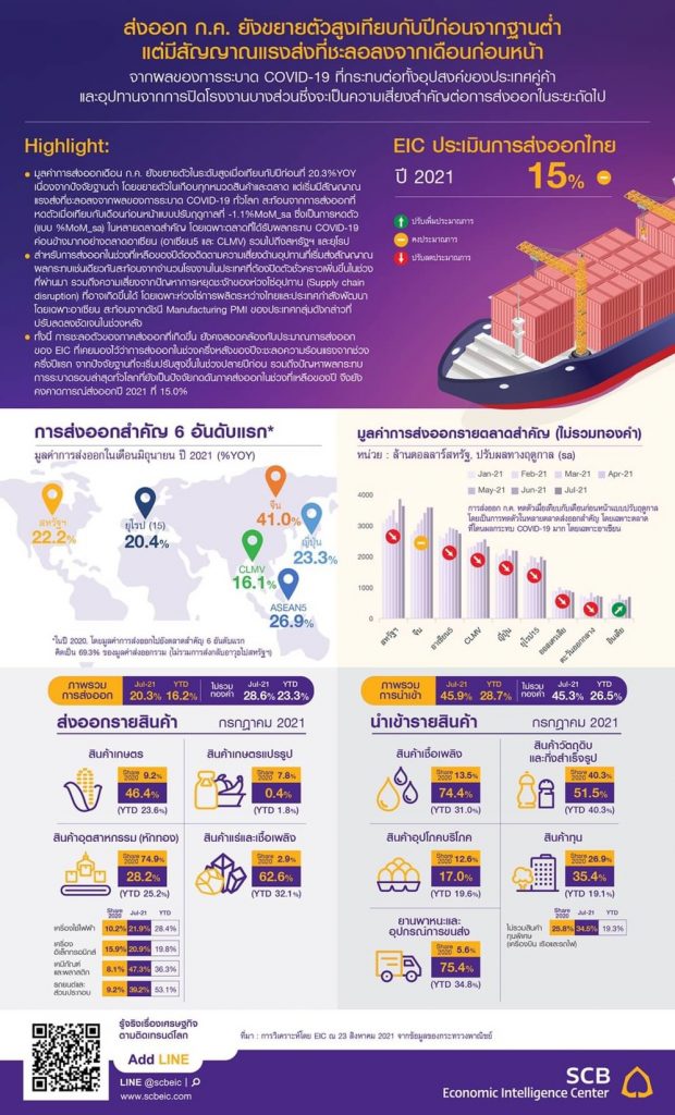ศูนย์วิจัยเศรษฐกิจและธุรกิจ Economic Intelligence Center (EIC) ธนาคารไทยพาณิชย์ เผยการส่งออกเดือนกรกฎาคมเริ่มส่งสัญญาณชะลอตัวจากผลของการระบาดโควิดทั่วโลก ที่กระทบต่อทั้งอุปสงค์ของประเทศคู่ค้าและอุปทานจากการปิดโรงงานบางส่วน แม้ในภาพรวมมูลค่าการส่งออกเดือนกรกฎาคมยังขยายตัวได้ 20.3% เทียบกับช่วงเดียวกันของปีก่อน