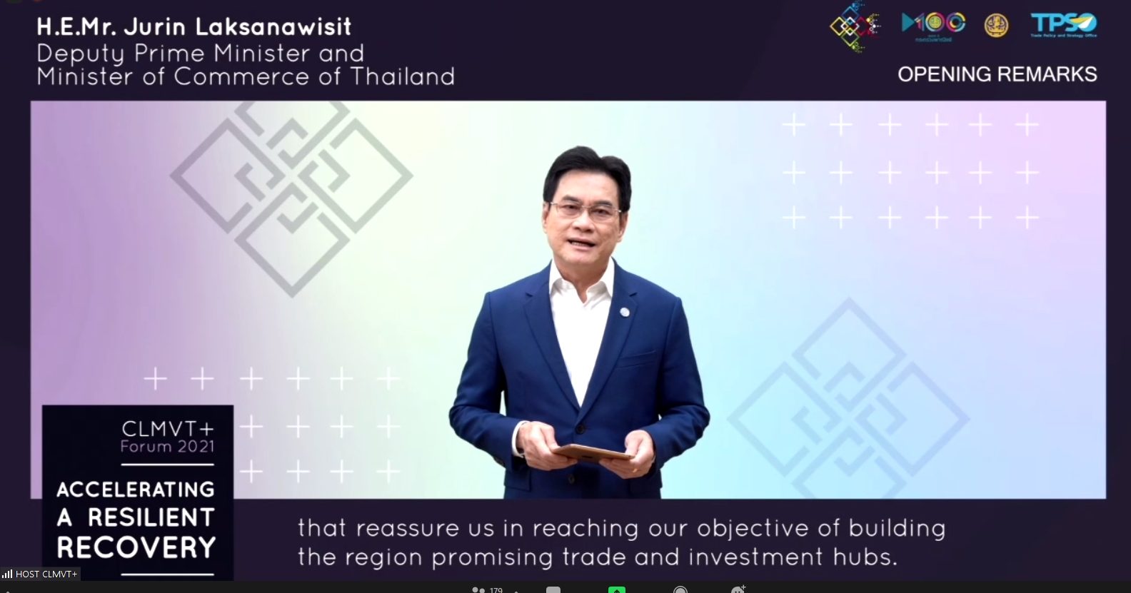นายจุรินทร์ ลักษณวิศิษฏ์ รองนายกรัฐมนตรีและรัฐมนตรีว่าการกระทรวงพาณิชย์ เปิดเผยในการเป็นประธานเปิดงานสัมมนา CLMVT+ Forum 2021: Accelerating a Resilient Recovery โดยมีเอกอัครราชทูตกัมพูชาและ สปป.ลาว เข้าร่วม โดย ท่ามกลางวิกฤติการแพร่ระบาดของโรคโควิด-19 ที่ส่งผลกระทบต่อทุกภาคส่วนอยู่ในปัจจุบัน การเยียวยาผู้ที่ได้รับผลกระทบทางเศรษฐกิจ ยังคงถือเป็นวาระเร่งด่วนที่รัฐบาลจากทุกประเทศต้องให้ความสำคัญ แต่ในขณะเดียวกัน ภาครัฐยังมีความจำเป็นที่จะต้องเตรียมพร้อมสำหรับการฟื้นฟูเศรษฐกิจหลังสถานการณ์โควิด-19 เพื่อขับเคลื่อนประเทศไปข้างหน้า จึงเป็นที่มาของการจัดงานในครั้งนี้ โดยประเทศไทยมีความมุ่งมั่นที่จะร่วมมือกับกัมพูชา สปป.ลาว เมียนมา และเวียดนาม รวมทั้งประเทศคู่ค้าสำคัญ ในการฟื้นฟูวิกฤติหลังโควิด-19 โดยใช้เศรษฐกิจเป็นตัวนำ และมุ่งมั่นที่จะส่งเสริมความเชื่อมโยงทางการค้าให้ CLMVT เป็นศูนย์กลางทางการค้าและการลงทุนในภูมิภาค