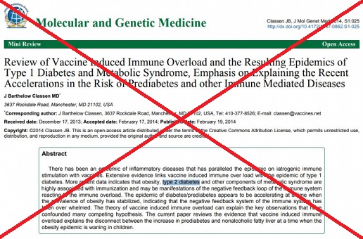 เป็นข้อมูลเท็จที่เผยแพร่โดย จอห์น บาร์ท คลาสเซน นักภูมิคุ้มกันวิทยาชาวอเมริกัน ที่อ้างว่าวัคซีนทุกชนิดกระตุ้นให้ร่างกายป่วยเป็นโรคเบาหวานชนิดที่ 1