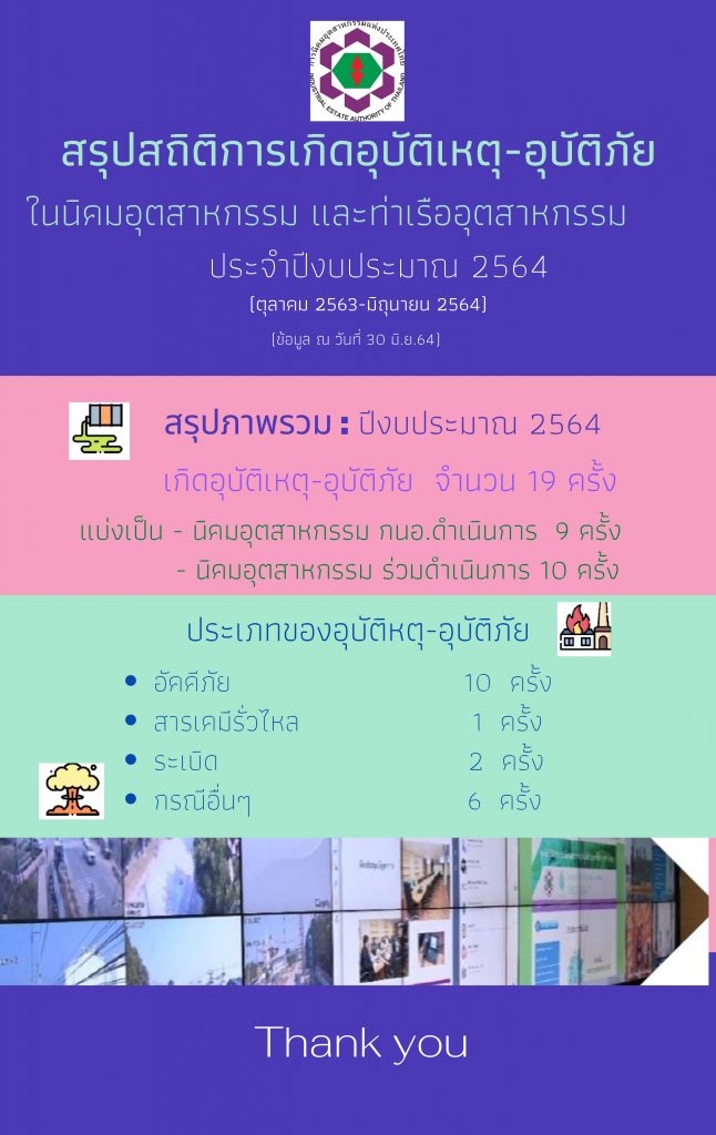 นายวีริศ อัมระปาล ผู้ว่าการการนิคมอุตสาหกรรมแห่งประเทศไทย (กนอ.) เปิดเผยถึงสถิติการเกิดอุบัติเหตุ อุบัติภัยจากการประกอบกิจการภายในนิคมอุตสาหกรรม และท่าเรืออุตสาหกรรม ในช่วง 9 เดือน (ต.ค.63 – มิ.ย.64) โดยเกิดอุบัติเหตุ/อุบัติภัย จำนวน 19 ครั้ง ซึ่งเมื่อเปรียบเทียบกับปีงบประมาณ 2563 พบว่ามีจำนวนเพิ่มขึ้น ร้อยละ 18.75 (ปี 2563 มีสถิติการเกิดอุบัติเหตุ/อุบัติภัย จำนวน 16 ครั้ง) โดยสาเหตุการเกิดอุบัติเหตุ อุบัติภัยส่วนใหญ่เกิดขึ้นจากพนักงานในโรงงานไม่ปฏิบัติตามขั้นตอนการปฏิบัติงาน รองลงมาเกิดจากอุปกรณ์ชำรุด/เครื่องจักรชำรุด โดยประเภทของอุบัติเหตุ/อุบัติภัยที่พบว่าเกิดขึ้นสูงสุด คือ เหตุเพลิงไหม้ และโรงงานที่เกิดเหตุสูงสุด คือโรงงานประกอบกิจการเกี่ยวกับเคมีภัณฑ์สารเคมี หรือวัสดุเคมี ซึ่งมิใช่ปุ๋ยอย่างใดอย่างหนึ่ง หรือหลายอย่าง อาทิ การทำเคมีภัณฑ์สารเคมี หรือวัสดุเคมี (โรงงานประเภทที่ 42(1)) โดยอุบัติเหตุเกิดขึ้นทั้งในนิคมอุตสาหกรรมที่ กนอ.ดำเนินงานเอง จำนวน 9 ครั้ง และนิคมอุตสาหกรรมร่วมดำเนินงาน จำนวน 10 ครั้ง (ต.ค.63 – มิ.ย.64) ขณะเดียวกันยังพบว่า มีอุบัติเหตุที่มีลักษณะการเกิดเหตุแตกต่างจากประเภทอื่นๆและเกิดขึ้นบ่อยครั้ง คือ กรณีระบบไฟฟ้าขัดข้อง ซึ่งส่งผลต่อกระบวนการผลิตของโรงงานด้วย