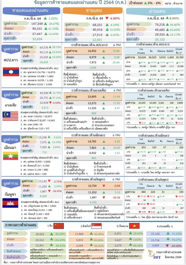 นายจุรินทร์ ลักษณวิศิษฏ์ รองนายกรัฐมนตรี และรัฐมนตรีว่าการกระทรวงพาณิชย์ กล่าวถึงตัวเลขยอดการค้าชายแดนและการค้าผ่านแดนของไทยเดือน กรกฎาคม 2564 โดยตัวเลขการส่งออก ผ่านการค้าชายแดนและการค้าผ่านแดน มีมูลค่ารวม 90,101 ล้านบาทเป็น ขยายตัวร้อยละ 41.70 และภาพรวมการส่งออกผ่านการค้าชายแดนและผ่านแดน 7 เดือนรวม 591,051 ล้านบาทเป็น ขยายตัวร้อยละ 37.88 ซึ่งเป็นการค้า 7 ประเทศ โดยเป็นการส่งออกผ่านการค้าชายแดนมี 4 ประเทศ คือมาเลเซีย เมียนมา ลาวและกัมพูชา ส่วนการส่งออกผ่านการค้าผ่านแดน คือ จีนเวียดนามและสิงคโปร์ รวมแล้วเป็น 7 ประเทศ โดยตัวเลขการส่งออกผ่านการค้าชายแดนและการค้าผ่านแดนเดือนกรกฎาคม 2564 เป็นบวกทุกตลาดทั้ง 7 ประเทศ โดยประเทศที่เป็นบวกสูงสุดคือจีน ถึงร้อยละ 126.44 สินค้าส่งออกผ่านแดนไปจีนที่บวกมากที่สุดคือผลไม้สดและผลไม้แห้งร้อยละ 348 มูลค่ารวม 15,000 ล้านบาท โดยเฉพาะทุเรียนมีมูลค่า 10,600 ล้านบาท มังคุด 4,700 ล้านบาท และลำไย 370 ล้านบาท เป็นต้น ตัวเลขภาพ