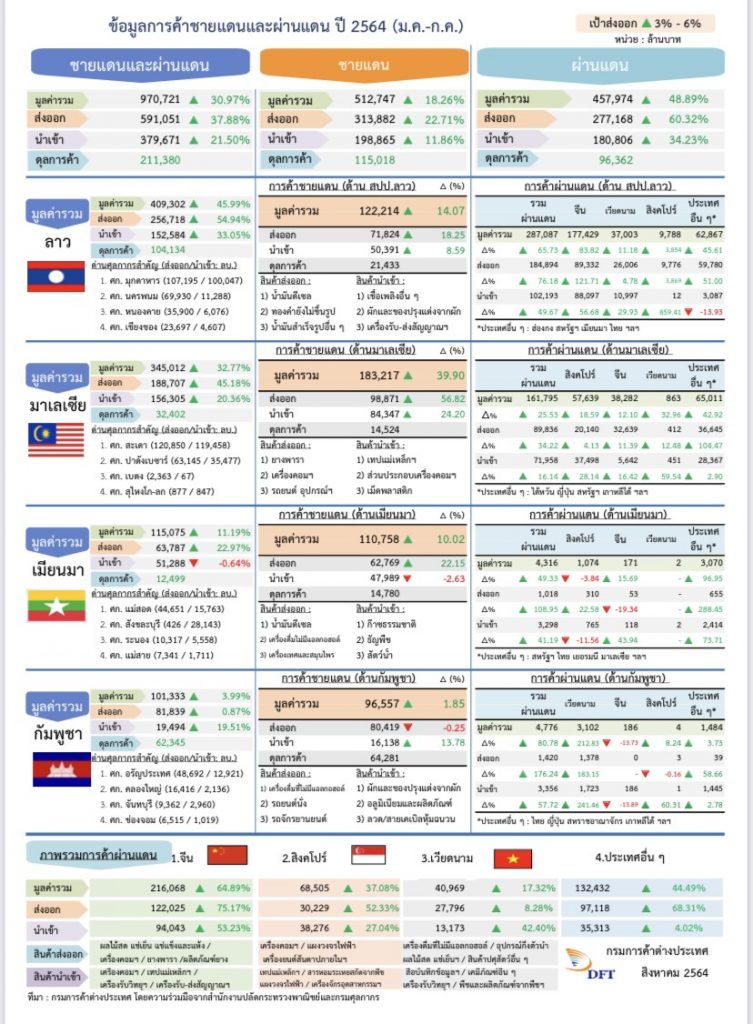ส่วนการส่งออกผ่านการค้าชายแดน 4 ประเทศรวมกันมีมูลค่า 40,416 ล้านบาท ร้อยละ 10.55 การส่งออกผ่านการค้าผ่านแดนใน 3 ประเทศที่เหลือคือ จีน เวียดนามและสิงคโปร์รวมกันมีมูลค่า 49,685 ล้านบาท ร้อยละ 83.8 โดยมาเลเซีย ร้อยละ 17.95 เมียนมา ร้อยละ 10.65 สปป.ลาว ร้อยละ 8.08 กัมพูชา ร้อยละ 5.12 จีน ร้อยละ 126.64 เวียดนาม ร้อยละ 1.63 และสิงคโปร์ ร้อยละ 59.85 โดยปัจจัยที่ส่งผลให้เป็นบวกถึง คือ 1.การทำงานร่วมกันอย่างหนักและต่อเนื่องของ กรอ.พาณิชย์ที่ประกอบด้วย กระทรวงพาณิชย์และภาคเอกชน ที่เป็นรูปธรรมที่สุดคือการเร่งเปิดจุดผ่านแดน ด่านทั้งหมดมี 97 ด่าน สามารถเปิดแล้วถึง 44 ด่าน จากปิดตัวไปเยอะตอนเจอโควิดใหม่ๆ