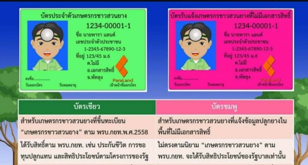นายณกรณ์ ตรรกวิรพัท ผู้ว่าการการยางแห่งประเทศไทย (กยท.) บอร์ด กยท. มีมติเป็นเอกฉันท์เห็นชอบปรับหลักเกณฑ์ วิธีการ และเงื่อนไขการขึ้นทะเบียนเกษตรกรชาวสวนยางใหม่ โดยให้ผู้ปลูกยางในพื้นที่ที่ไม่มีเอกสารสิทธิ์การใช้ที่ดิน (บัตรชมพู) สามารถขึ้นทะเบียนเกษตรกรชาวสวนยางได้เช่นเดียวกับผู้ปลูกยางในพื้นที่ที่มีเอกสารสิทธิ์ (บัตรเขียว) เพื่อให้สามารถดูแลเกษตรกรชาวสวนยางทั้งประเทศอย่างทั่วถึง สร้างความเท่าเทียม และลดความเหลื่อมล้ำด้านสิทธิประโยชน์ โดยเตรียมออกประกาศคณะกรรมการ กยท.เร็วๆ นี้