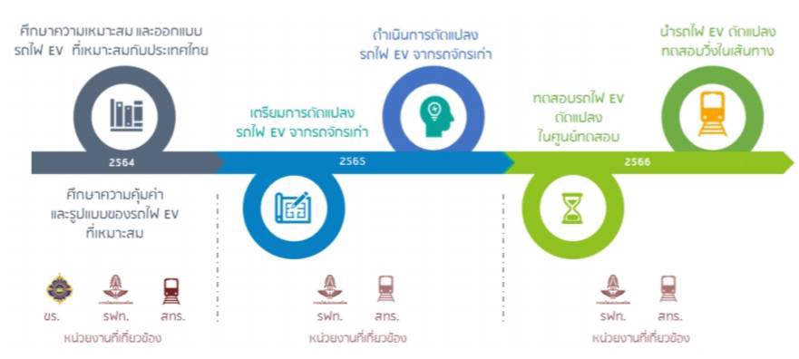 นอกจากนี้ ยังได้ดำเนินการจัดทำแผนการดำเนินงาน นำรถไฟขับเคลื่อนด้วยระบบไฟฟ้า EV on Train มาใช้ในประเทศไทย โดยมีแผนครอบคลุมตั้งแต่ปี 2564 จนถึงปี 2576 โดยมีโครงการระยะสั้น ที่ทาง ขร. ร่วมกับ รฟท. สถาบันวิจัยและพัฒนาเทคโนโลยีระบบราง (องค์การมหาชน) และสถาบันการศึกษา จะร่วมมือกันปรับปรุงรถจักรเก่า GEK หรือ Alsthom เป็นระบบ Battery Locomotive จำนวน 4 คัน ให้แล้วเสร็จในปี 2566 และโครงการจัดหารถจักรสับเปลี่ยน (Battery Shunting Locomotive) จำนวน 20 คัน ที่จะนำมาใช้งานภายในปี 2567