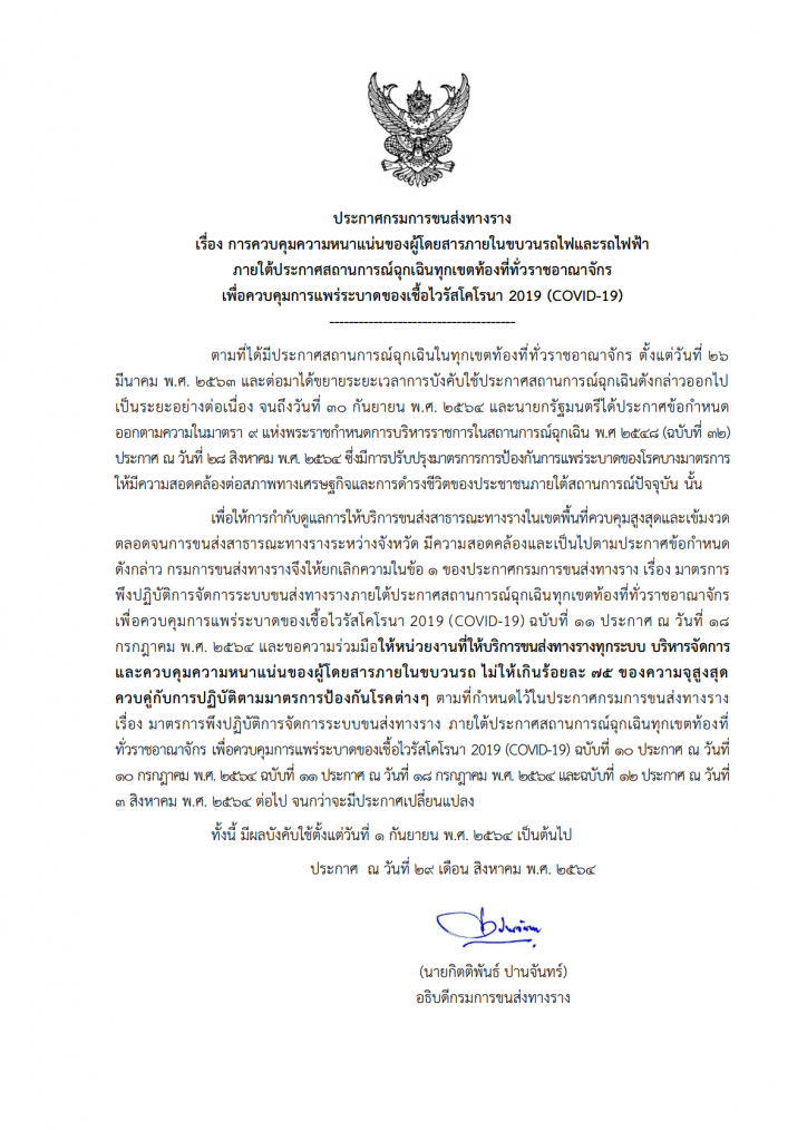 นายกิตติพันธ์ ปานจันทร์ อธิบดี กรมการขนส่งทางราง (ขร.) ลงนามออกประกาศกรมการขนส่งทางราง เรื่อง การควบคุมความหนาแน่นของผู้โดยสารภายในขบวนรถไฟและรถไฟฟ้า หลังจากรัฐบาลได้มีการออกประกาศข้อกำหนดตามความในมาตรา 9 แห่งพระราชกำหนดการบริหารราชการในสถานการณ์ฉุกเฉิน พ.ศ.2548 (ฉบับที่ 32) ประกาศ ณ วันที่ 28 สิงหาคม พ.ศ. 2564 ผ่อนคลายล็อกดาวน์ 29 จังหวัดพื้นที่สีแดงเข้ม ซึ่งมีการเปิดให้ทำกิจกรรมต่างๆ มากขึ้น รวมทั้งเรื่องการขนส่งสาธารณะ โดยมีการให้เพิ่มจำนวนผู้โดยในการใช้ระบบขนส่งสาธารณะมากขึ้น แต่เกินไม่เกินร้อยละ 75 ของความจุผู้โดยสารสำหรับยานพาหนะแต่ละประเภท และต้องจัดให้มีการเว้นระยะห่าง การมีระบบระบายอากาศที่ดี การแวะพักตามช่วงเวลา รวมทั้งการปฏิบัติตามมาตรการด้านสาธารณสุขที่ทางราชการกำหนดอย่างเคร่งครัด