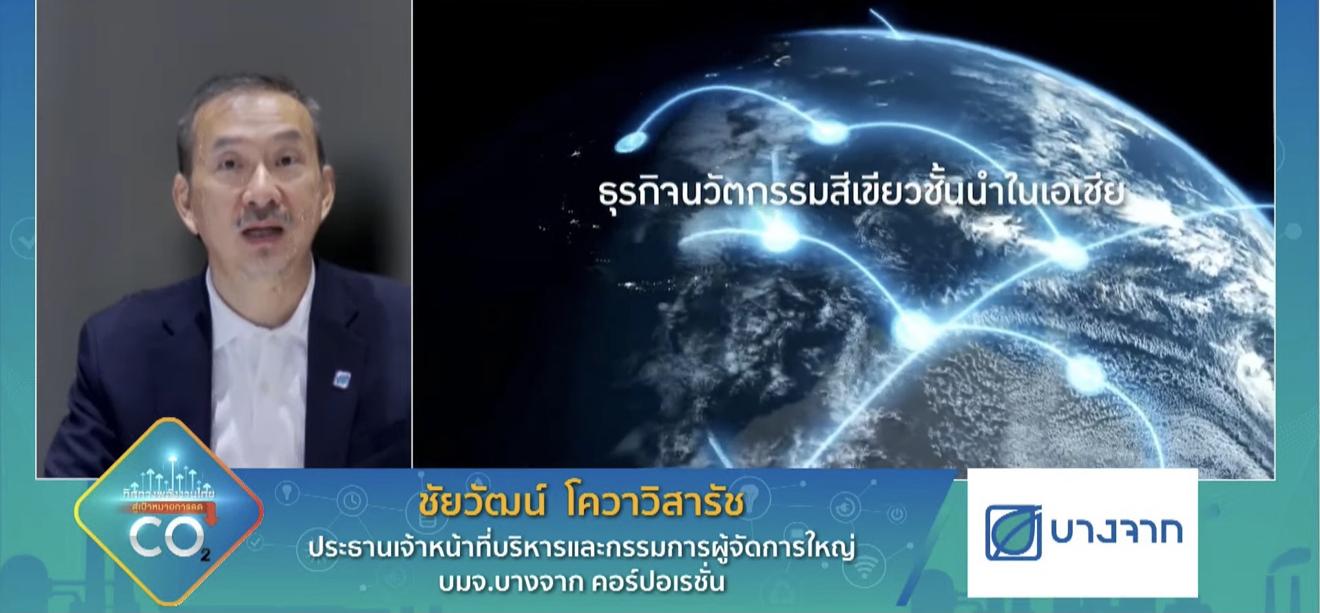 นายชัยวัฒน์ โควาวิสารัช ประธานเจ้าหน้าที่บริหารและกรรมการผู้จัดการใหญ่ บริษัท บางจาก คอร์ปอเรชั่น จำกัด (มหาชน) กล่าวถึงทิศทางของอุตสาหกรรมน้ำมันของโลกว่าจะมีประมาณการจุดสูงสุดของความต้องการน้ำมันโลก (peak oil demand) ในเวลาอีกไม่กี่สิบปีข้างหน้า ดังนั้นองค์กรที่อยู่ในธุรกิจนี้จะต้องเผชิญกับการเปลี่ยนแปลงทางโครงสร้างรับการเปลี่ยนเปลง ซึ่งภาพรวมของโลกในการปล่อยก๊าซเรือนกระจก (GHG) นั้น อยู่ที่มากกว่า 45,000 ล้านตันต่อปี ในขณะที่ประเทศไทยปล่อยที่ประมาณ 0.9-1.0% ของโลก (ประมาณ 400 ล้านตัน/ปี) ซึ่งเมื่อพิจารณาว่า GDP ของไทยคิดเป็น 0.5% ของ GDP โลก แสดงว่าประเทศไทยมีการปล่อยเกินไปเป็นเท่าตัว ดังนั้น ไทยควรเร่งและกระตุ้นการลดการปล่อย GHG ในส่วนของธุรกิจของกลุ่มบางจากฯ คิดเป็นประมาณ 1% ของ GDP ของประเทศไทย ขณะที่ปล่อย GHG ประมาณ 0.2% ของปริมาณที่ประเทศไทยปล่อยเท่านั้น