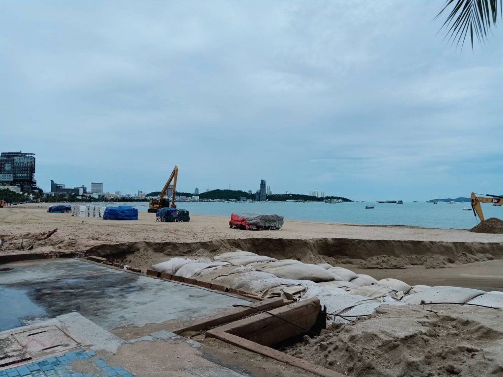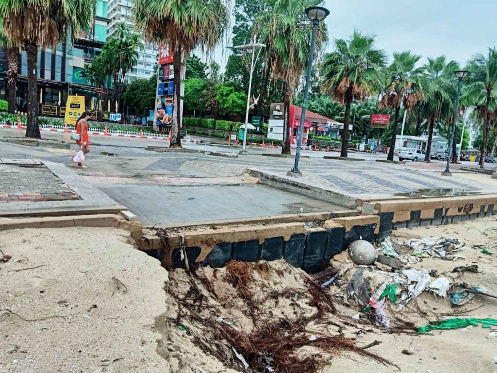 และเมื่อเข้าสู่ฤดูฝนชายหาดพัทยาจะประสบปัญหาน้ำท่วมเมืองพัทยา และไหลระบายลงสู่ชายหาดพัทยา ทำให้หาดทรายได้รับความเสียหายซ้ำซาก และจากการตรวจสอบพบความเสียหายตลอดแนวชายหาดพัทยา ได้แก่ 1. บริเวณ พัทยาเหนือ ซอย 5 ความเสียหายความกว้างประมาณ 10 เมตร เป็นร่องลึกประมาณ 3 เมตร ,2. บริเวณ พัทยาเหนือ ซอย 6 ความเสียหายความกว้างประมาณ 15 เมตร เป็นร่องลึกประมาณ 3 เมตร ฅ,3. บริเวณ พัทยากลาง ความเสียหายความกว้างประมาณ 8 เมตร เป็นร่องลึกประมาณ 2 เมตร, 4. บริเวณ พัทยากลาง ซ.9 (หน้า Central) ความเสียหายความกว้างประมาณ 15 เมตร เป็นร่องลึกประมาณ 3 เมตร+ และ 5. บริเวณ พัทยากลาง ซ.10 ความเสียหายความกว้างประมาณ 8 เมตร เป็นร่องลึกประมาณ 2 เมตร