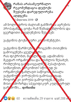 ข้อมูลเท็จจาก Facebook เผยแพร่ในประเทศจอร์เจียและถูกแชร์ไปเกือบ 300 ครั้ง โดยอ้างว่าวัคซีนหลายชนิดมีสารพิษอลูมิเนียมเป็นส่วนประกอบ และนำไปสู่การป่วยเป็นโรคอัลไซเมอร์ หลังพบสารอลูมิเนียมอยู่ในสมองของผู้เสียชีวิตที่เคยป่วยเป็นโรคอัลไซเมอร์