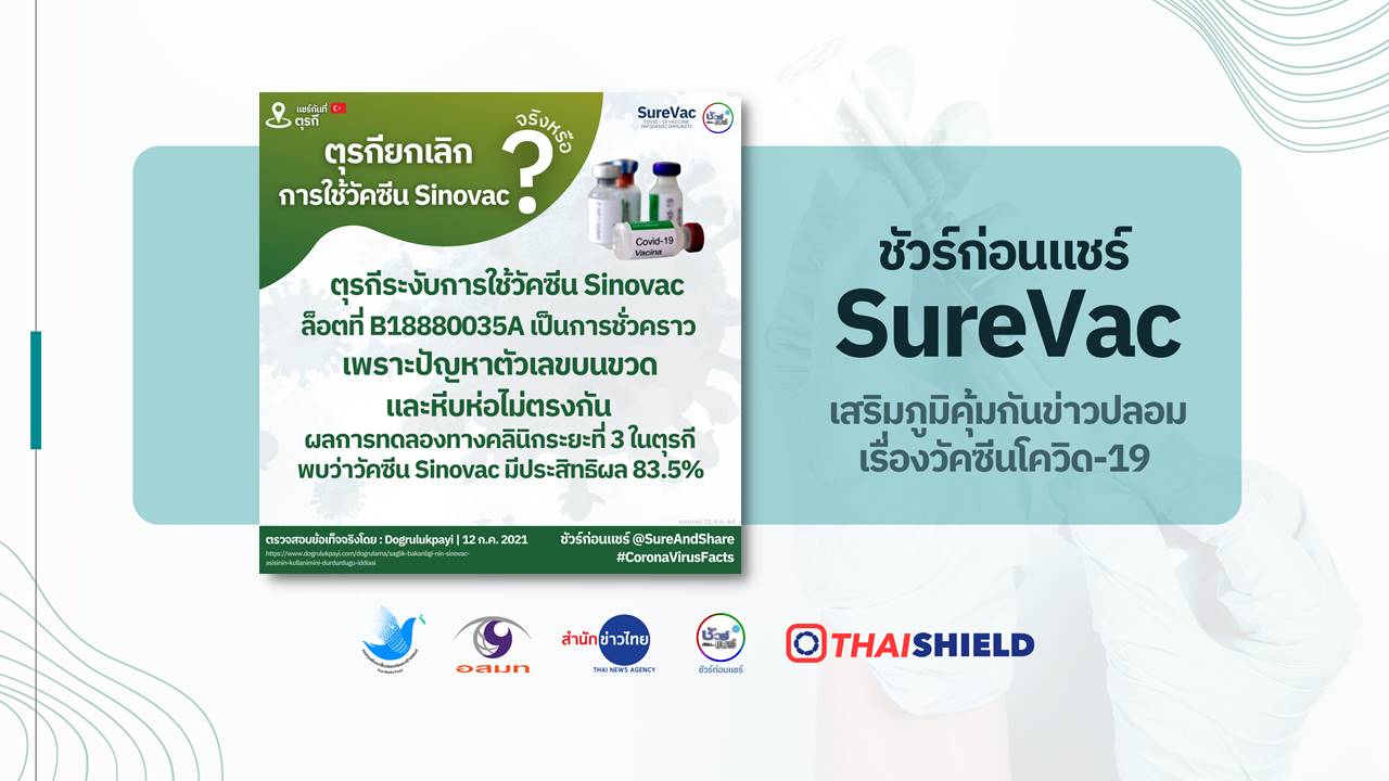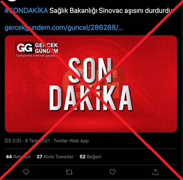 มีข้อมูลเท็จเผยแพร่ทาง Twitter ในประเทศตุรกี โดยอ้างว่ากระทรวงสาธารณสุขตุรกีประกาศยกเลิกการใช้วัคซีนโควิด 19 ของบริษัท Sinovac เป็นที่เรียบร้อยแล้ว