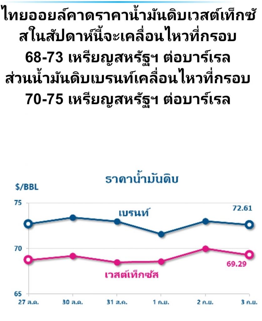 บมจ. ไทยออยล์คาดราคาน้ำมันดิบเวสต์เท็กซัสในสัปดาห์นี้(6 -10 ก.ย. 64) จะเคลื่อนไหวที่กรอบ 68-73 เหรียญสหรัฐฯ ต่อบาร์เรล ส่วนน้ำมันดิบเบรนท์เคลื่อนไหวที่กรอบ 70-75 เหรียญสหรัฐฯ ต่อบาร์เรล มีแนวโน้มทรงตัว หลังกลุ่มโอเปกพลัสมีมติคงกำลังการผลิตตามแผนเดิม ขณะที่ตลาดกังวลปริมาณน้ำมันดิบสหรัฐฯ จะกลับมาดำเนินการช้า จากการหยุดดำเนินการผลิตของแท่นขุดเจาะน้ำมันดิบ เนื่องจากการพัดถล่มของพายุเฮอริเคนไอดาในสัปดาห์ที่ผ่านมา นอกจากนั้นราคาน้ำมันดิบได้รับแรงหนุนจากการอ่อนค่าของเงินสกุลดอลลาร์ หลังธนาคารกลางสหรัฐฯ มีแผนจะคงมาตรการ QE นานกว่าที่คาด อย่างไรก็ตาม ราคาน้ำมันดิบยังคงเผชิญกับแรงกดดันจากจำนวนผู้ติดเชื้อโควิด-19 ที่ยังคงเพิ่มขึ้นสูงต่อเนื่องทั่วโลก ทำให้หลายประเทศคงมาตรการจำกัดการเดินทางเพื่อลดการแพร่ระบาด