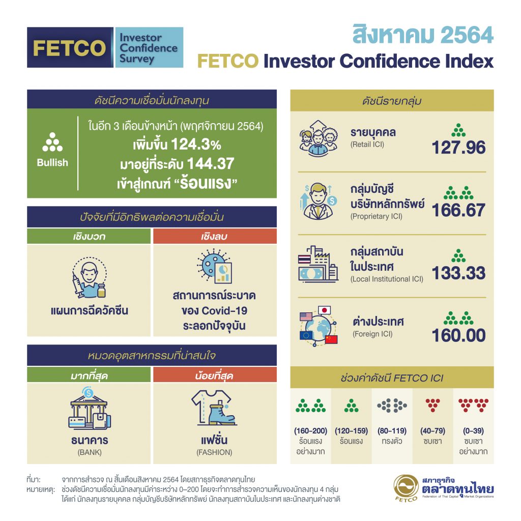 นายไพบูลย์ นลินทรางกูร ประธานกรรมการสภาธุรกิจตลาดทุนไทย เปิดเผยดัชนีความเชื่อมั่นนักลงทุน (FETCO Investor Confidence Index) ผลสำรวจในเดือนสิงหาคม 2564 พบว่า “ดัชนีความเชื่อมั่นนักลงทุน (FETCO Investor Confidence Index : ICI) ในอีก 3 เดือนข้างหน้า อยู่ที่ระดับ 144.37 ปรับตัวเพิ่มขึ้น 124.3% จากเกณฑ์ซบเซาเดือนก่อนมาอยู่ในเกณฑ์ “ร้อนแรง” คาดหวังแผนการฉีดวัคซีนเพื่อคลี่คลายสถานการณ์ Covid-19 เป็นปัจจัยหนุนมากที่สุด รองลงมา คือ การฟื้นตัวของเศรษฐกิจและเงินทุนไหลเข้า