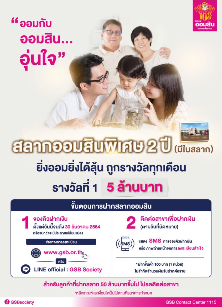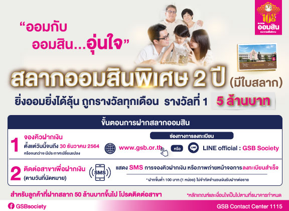 นายวิทัย รัตนากร ผู้อำนวยการธนาคารออมสิน เปิดเผยว่า ด้วยธนาคารออมสินได้เปิดให้ประชาชนฝากเงินในรูปแบบ “สลากออมสินพิเศษ 2 ปี (มีใบสลาก)” ซึ่งเป็นผลิตภัณฑ์เงินฝากที่ได้รับความนิยมจากลูกค้าจำนวนมาก และมีเสียงเรียกร้องให้ธนาคารเปิดรับฝากเงินรูปแบบดังกล่าวอีกครั้ง โดยสลากออมสินพิเศษ 2 ปี (มีใบสลาก) ที่เปิดรับฝากในครั้งนี้ ราคาหน่วยละ 100 บาท กำหนดระยะเวลาการฝาก 2 ปี หากฝากครบกำหนดได้รับดอกเบี้ย 0.10 บาทต่อหน่วย พร้อมรับสิทธิลุ้นถูกรางวัลเลขสลากรวม 24 ครั้ง ตามกำหนดการออกรางวัลทุกวันที่ 1 ของเดือน เงินรางวัลสูงสุด รางวัลที่ 1 เป็นเงิน 5,000,000 บาท รางวัลที่ 2 เป็นเงิน 1,000,000 บาท และรางวัลอื่น ๆ รวมถึงรางวัลเลขท้าย ผู้ที่สนใจสามารถลงทะเบียนจองคิวนัดหมายเพื่อฝากเงินที่สาขา ผ่าน 2 ช่องทาง คือ เว็บไซต์ธนาคารออมสิน www.gsb.or.th และที่ LINE Official : GSB Society ได้ตั้งแต่บัดนี้เป็นต้นไป จนถึง 30 ธันวาคม 2564 หรือจนกว่าธนาคารจะแจ้งเปลี่ยนแปลง ทั้งนี้ การเปิดให้ลงทะเบียนล่วงหน้า เพื่อเป็นการรักษาระยะห่างตามมาตรการกระทรวงสาธารณสุข ป้องกันไม่ให้ลูกค้าไปติดต่อที่สาขาพร้อมกันเป็นจำนวนมาก ในช่วงสถานการณ์การแพร่ระบาดของโควิด 19