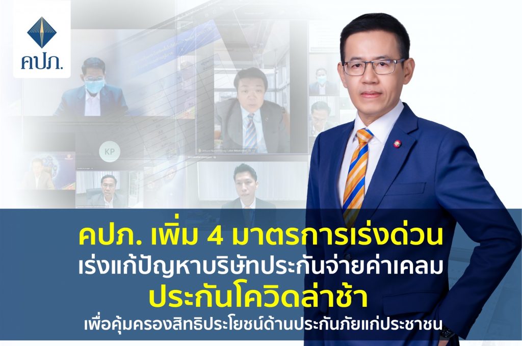 กรุงเทพฯ 8 ก.ย.-คปภ. เพิ่ม 4 มาตรการเร่งด่วน เร่งแก้ปัญหาบริษัทประกันจ่ายค่าเคลมประกันโควิดล่าช้า เพื่อคุ้มครองสิทธิประโยชน์ด้านประกันภัยแก่ประชาชน