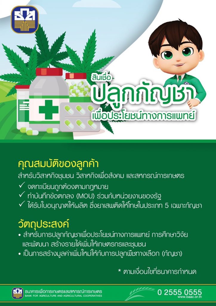 กรุงเทพฯ 8 ก.ย.- ธ.ก.ส. สนับสนุนสินเชื่อปลูกกัญชา เพื่อใช้ประโยชน์ทางการแพทย์ และการศึกษาวิจัยพัฒนา ผ่านสินเชื่อธุรกิจชุมชนสร้างไทย อัตราดอกเบี้ยร้อยละ 0.01 ต่อปี หรือล้านละร้อย หรือสินเชื่อที่เหมาะสมกับธุรกิจ โดยผู้กู้ต้องจดทะเบียนเป็นวิสาหกิจชุมชน วิสาหกิจเพื่อสังคม หรือสหกรณ์การเกษตรที่จดทะเบียนถูกต้องตามกฎหมาย มีการจัดทำ MOU ในการดำเนินการภายใต้ความร่วมมือและกำกับดูแลระหว่างผู้ขอกู้กับหน่วยงานของรัฐหรือสถาบันอุดมศึกษา และได้รับใบอนุญาตให้ผลิตยาเสพติดให้โทษในประเภท 5 เฉพาะกัญชา จาก อย. สนใจติดต่อสอบถามได้ที่ ธ.ก.ส. ทุกสาขาทั่วประเทศ