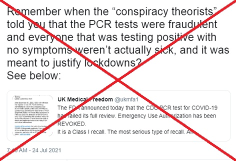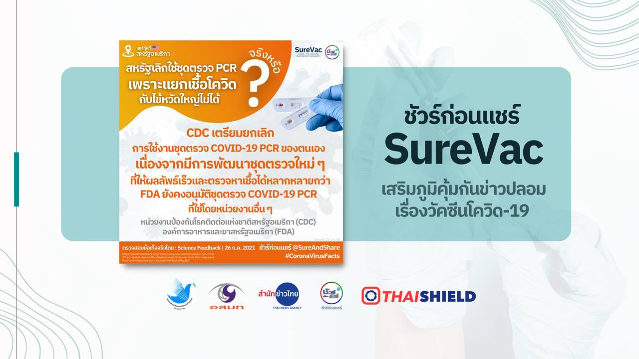 มีข้อมูลเท็จเผยแพร่ทางสื่อสังคมออนไลน์ในสหรัฐอเมริกา ที่อ้างว่าหน่วยงานป้องกันโรคติดต่อแห่งชาติสหรัฐอเมริกา (CDC) ยกเลิกการใช้ชุดตรวจ PCR หลังจากยอมรับว่าเป็นชุดตรวจที่ไม่สามารถแยกเชื้อไวรัสโควิด 19 จากไวรัสไข้หวัดใหญ่ได้ จนมีการแชร์ข้อความดังกล่าวไปหลายหมื่นครั้ง