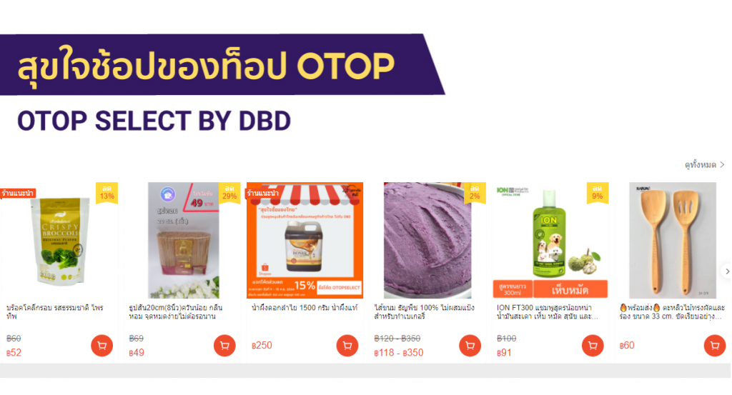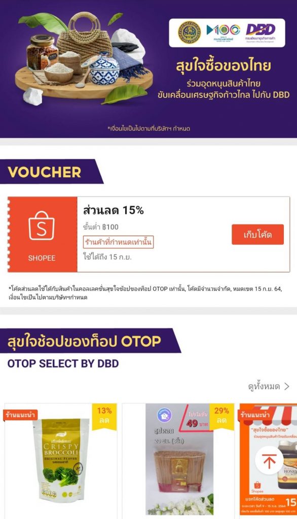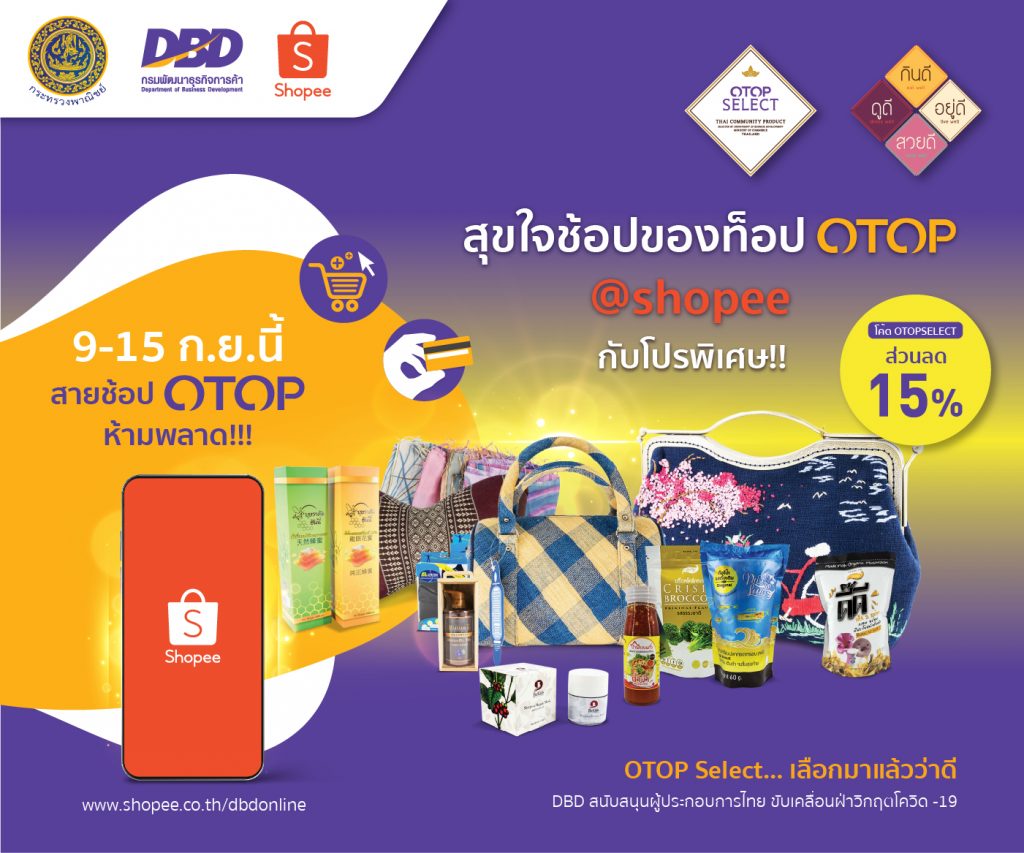 นายทศพล ทังสุบุตร อธิบดีกรมพัฒนาธุรกิจการค้า เปิดเผยว่า จากสถานการณ์การแพร่ระบาดของโรคโควิด-19 ส่งผลให้สถานการณ์การตลาดเปลี่ยนแปลงไปสู่ตลาดวิถีใหม่แบบ New Normal ที่ผู้บริโภคนิยมซื้อสินค้าผ่านช่องทางออนไลน์เพิ่มมากขึ้นแบบก้าวกระโดด ประกอบกับมาตรการป้องกันการแพร่ระบาดของโรคโควิด-19 ทำให้ไม่สามารถจัดกิจกรรมส่งเสริมการตลาดในช่องทางออฟไลน์ได้ กรมพัฒนาธุรกิจการค้า จึงปรับเปลี่ยนแนวทางการส่งเสริมการตลาดผลิตภัณฑ์ OTOP เพื่อช่วยเหลือสนับสนุนผู้ประกอบการชุมชนให้สามารถเดินหน้าฝ่าวิกฤติโควิด-19 ไปได้ โดยเน้นผลักดันตลาดผลิตภัณฑ์ OTOP เข้าสู่ช่องทางออนไลน์ให้มากขึ้น จึงได้ประสานความร่วมมือกับแพลตฟอร์มออนไลน์ชื่อดังอย่าง Shopee จัดแคมเปญ “สุขใจช้อปของท็อป OTOP” ระหว่างวันที่ 9-15 กันยายน 2564 พร้อมมอบโค้ดส่วนลดพิเศษ 15% สำหรับผลิตภัณฑ์ OTOP Select ที่ผ่านการคัดเลือกจากกรมพัฒนาธุรกิจการค้ากว่า 50 ร้านค้า ขึ้นไปจำหน่ายบนแพลตฟอร์ม Shopee รวมกว่า 2,000 ผลิตภัณฑ์ มีทั้งอาหาร เครื่องดื่ม ของใช้ ของตกแต่ง ของที่ระลึก เสื้อผ้า เครื่องแต่งกาย รวมถึงสมุนไพรที่ไม่ใช่อาหารที่ผ่านการคัดสรรมาแล้ว โดยสามารถเลือกช้อปรับส่วนลดง่ายๆ เพียงกรอก Code “OTOPSELECT” ผ่านช่องทาง https://shopee.co.th/dbdonline หรือ ทางแอปพลิเคชัน Shopee