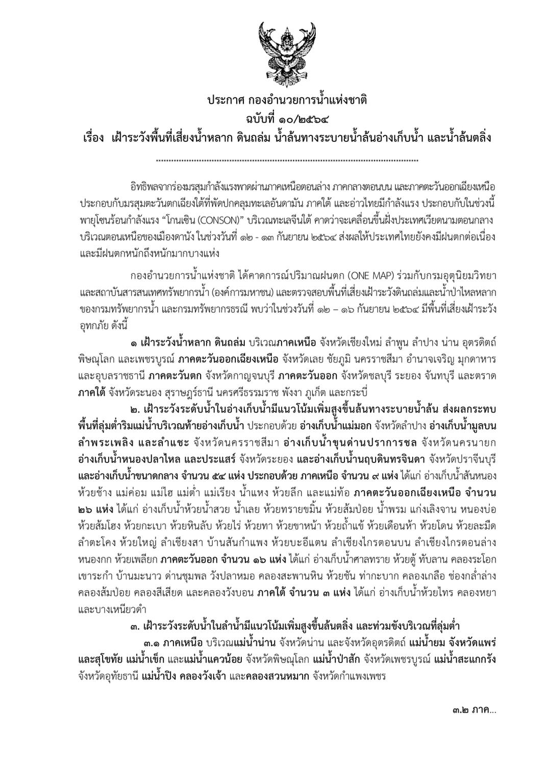 ประกาศ กองอำนวยการน้ำแห่งชาติ ฉบับที่ 10/2564 เรื่อง เฝ้าระวังพื้นที่เสี่ยงน้ำหลาก ดินถล่ม น้ำล้นทางระบายน้ำล้นอ่างเก็บน้ำ และน้ำล้นตลิ่ง