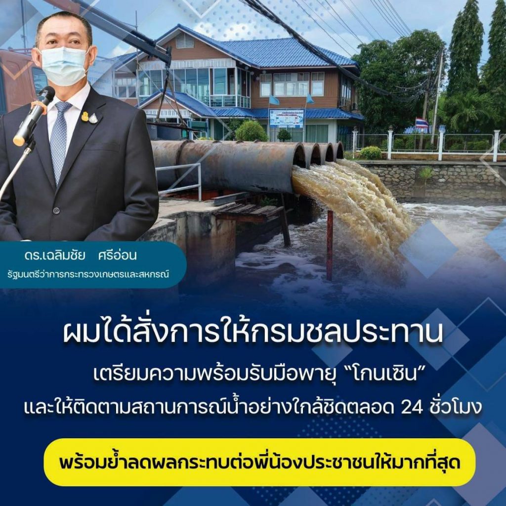 นายเฉลิมชัย ศรีอ่อน รัฐมนตรีว่าการกระทรวงเกษตรและสหกรณ์กล่าวว่า สั่งการให้กรมชลประทานเตรียมพร้อมรับสถานการณ์ฝนตกหนักจากพายุ “โกนเซิน” รวมถึงเร่งระบายน้ำจากฝนที่ตกหนักต่อเนื่องจากช่วงที่ผ่านมา ล่าสุดได้รับรายงานว่า กรมชลประทานติดตั้งเครื่องสูบน้ำตามคลองต่างๆที่เชื่อมต่อกับคลองพระองค์ไชยานุชิตเนื่องจากระดับน้ำสูงสูงขึ้นจนเอ่อล้นตลิ่งในเขตจังหวัดฉะเชิงเทราและสมุทรปราการเพื่อเร่งระบายน้ำออกสู่ทะเลอ่าวไทย โดยได้ย้ำให้ดำเนินการอย่างเต็มศักยภาพการเพื่อให้สถานการณ์น้ำกลับสู่ภาวะปกติโดยเร็วที่สุด พร้อมกันนี้ให้หน่วยงานต่างๆ เข้าช่วยเหลือและบรรเทาความเดือดร้อนของเกษตรกรและประชาชนที่เกิดจากสถานการณ์น้ำทุกพื้นที่
