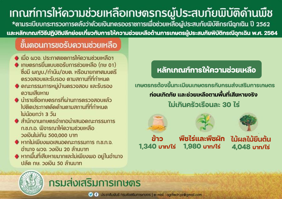 ทั้งนี้ เกษตรกรซึ่งประสบภัยพิบัติที่จะได้รับความช่วยเหลือจะต้องขึ้นทะเบียนเกษตรกรกับกรมส่งเสริมการเกษตรก่อนเกิดภัยพิบัติ โดยต้องยื่นแบบความจำนงขอรับการช่วยเหลือ (กษ 01) ซึ่งผู้นำชุมชนรับรอง เมื่อเจ้าหน้าที่ตรวจสอบทะเบียนเกษตรกรและพื้นที่เสียหายจริงแล้ว จะพิจารณาให้ความช่วยเหลือตามขั้นตอน โดยได้รับการช่วยเหลือตามพื้นที่เสียหายจริง แต่ไม่เกินครัวเรือนละ 30 ไร่ ซึ่งมีอัตราการช่วยเหลือดังนี้ ข้าว 1,340 บาทต่อไร่ พืชไร่และพืชผัก 1,980 บาทต่อไร่ ไม้ผลไม้ยืนต้นและอื่นๆ 4,048 บาทต่อไร่