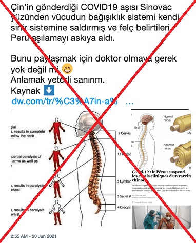 มีข้อความโจมตีความปลอดภัยของวัคซีนโควิด 19 ของบริษัท Sinovac เผยแพร่บนสื่อสังคมออนไลน์ในประเทศตุรกี โดยอ้างว่า Deutsche Welle สื่อของประเทศเยอรมนีรายงานพบชาวเปรูที่รับวัคซีน Sinovac แล้วป่วยเป็นอัมพาต เนื่องจากวัคซีนเข้าไปทำลายระบบภูมิคุ้มกันและนำไปสู่การป่วยเป็นโรคกลุ่มอาการกิลแลง-บาร์เร (GBS) โรคแพ้ภูมิตัวเองซึ่งเกิดกับระบบประสาทส่วนปลาย ก่อให้เกิดอาการแขนขาอ่อนแรง, เหน็บชาตามร่างกาย และอาจรุนแรงจนกลายเป็นอัมพาตในที่สุด